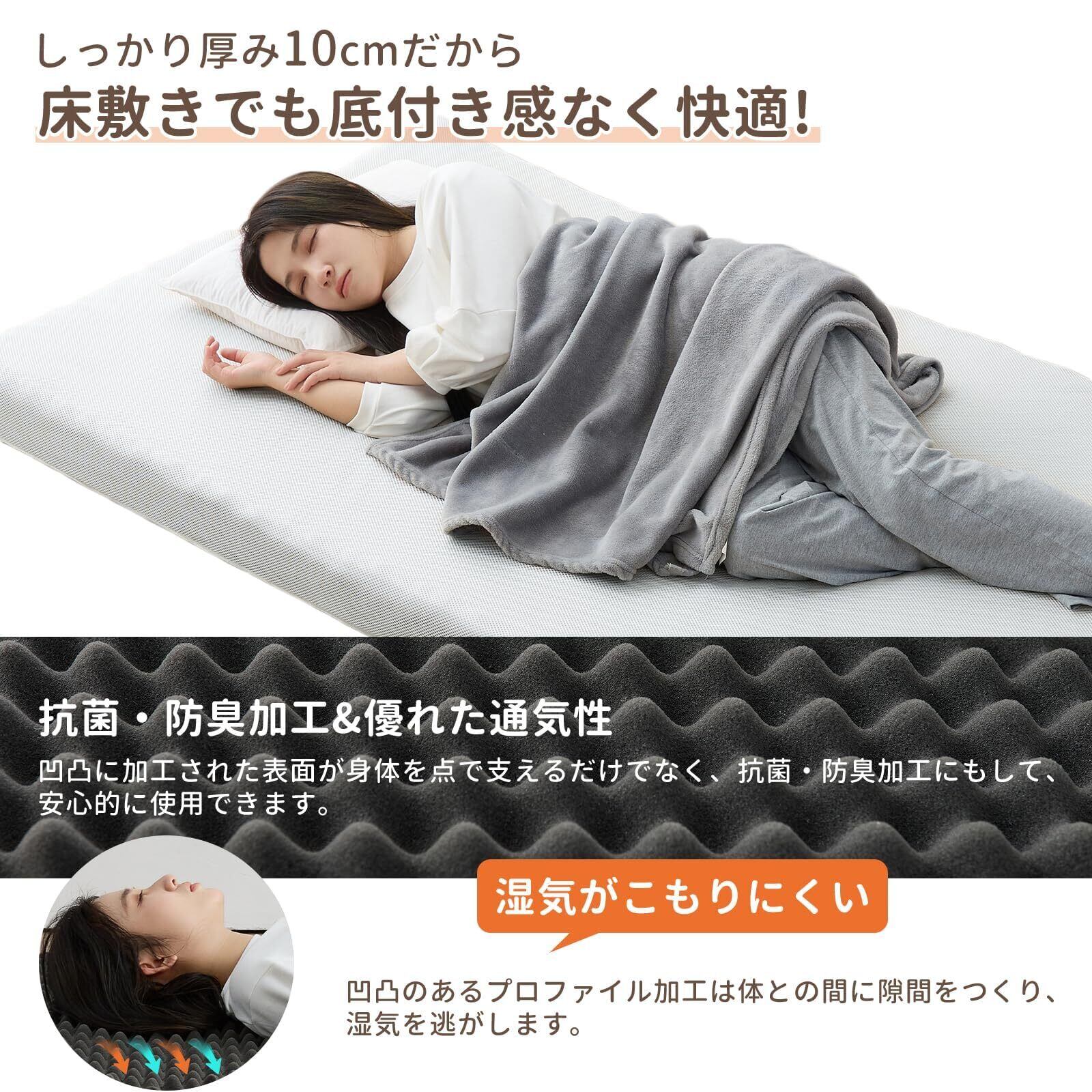 【高反発素材】サイズ:97x195x10cm(シングル);カバーの表地(洗えるカバー):3Dメッシュ、いつでもサラサラ!カバーの裏面:やわらかいマイクロファイバー生地。中材:厚さ10cmの凹凸加工高反発ウレタンフォーム(復元率98%、密度24D、硬さ190N)-高反発ウレタンは、優れたクッション性と復元性で過度な沈み込みを抑え下から持ち上げるように体を支えて、長期間使用していても形崩れにくい、あなたの快眠をサポートします。