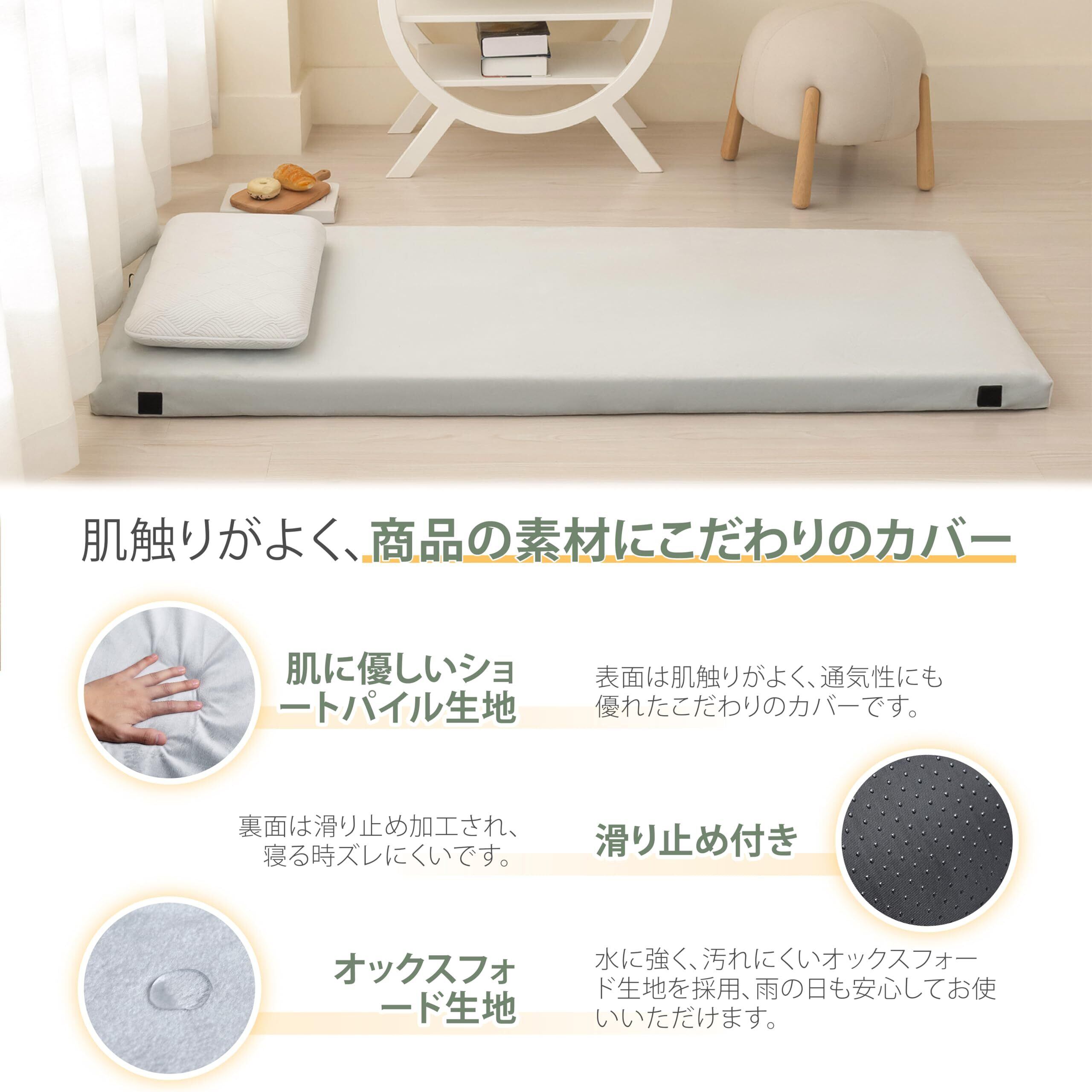 コンパクトに折りたたむことができ、バックルで固定できます。丸めて収納すれば、持ち運びも簡単!来客用のお布団や、お昼寝マットとしてもおすすめです。