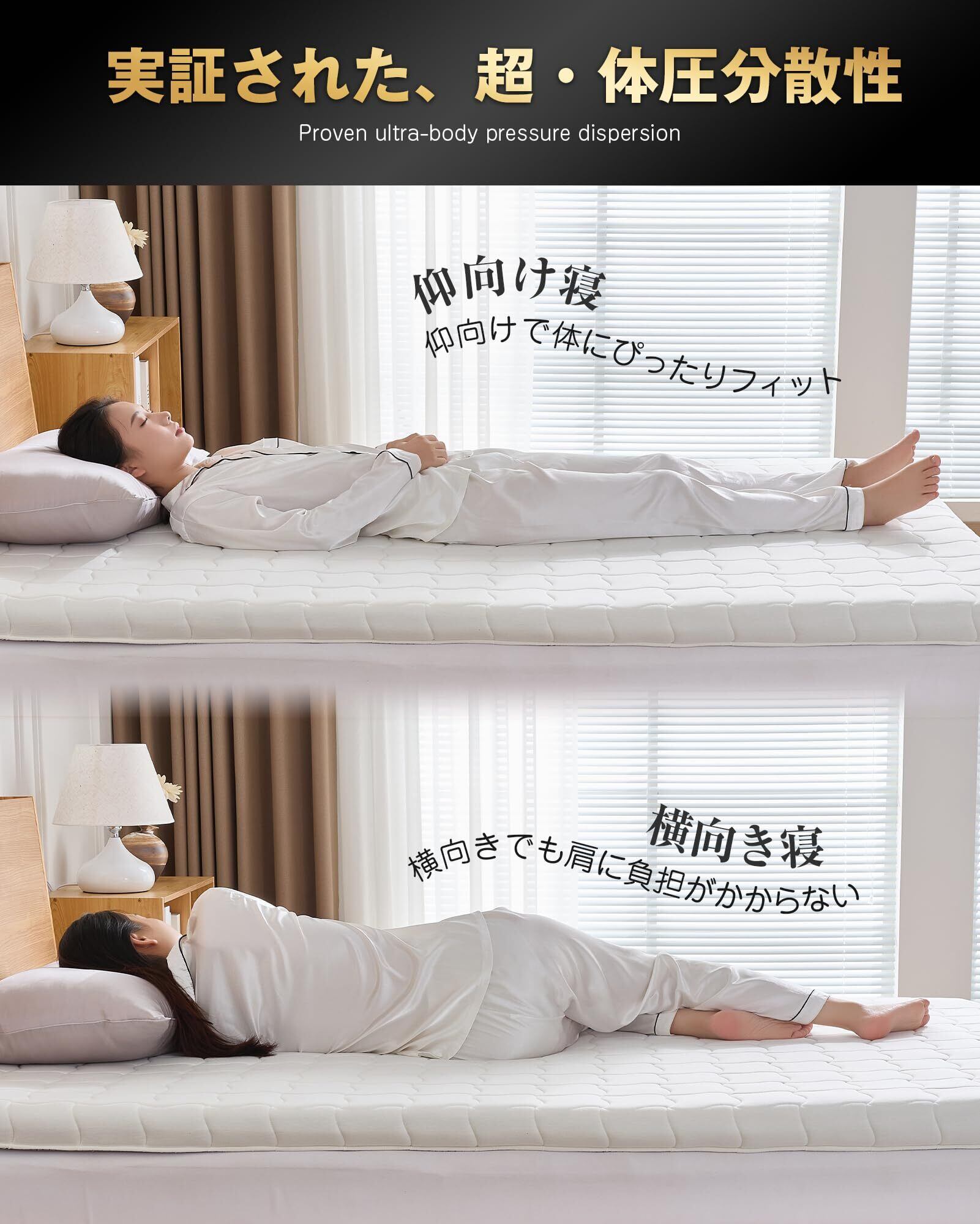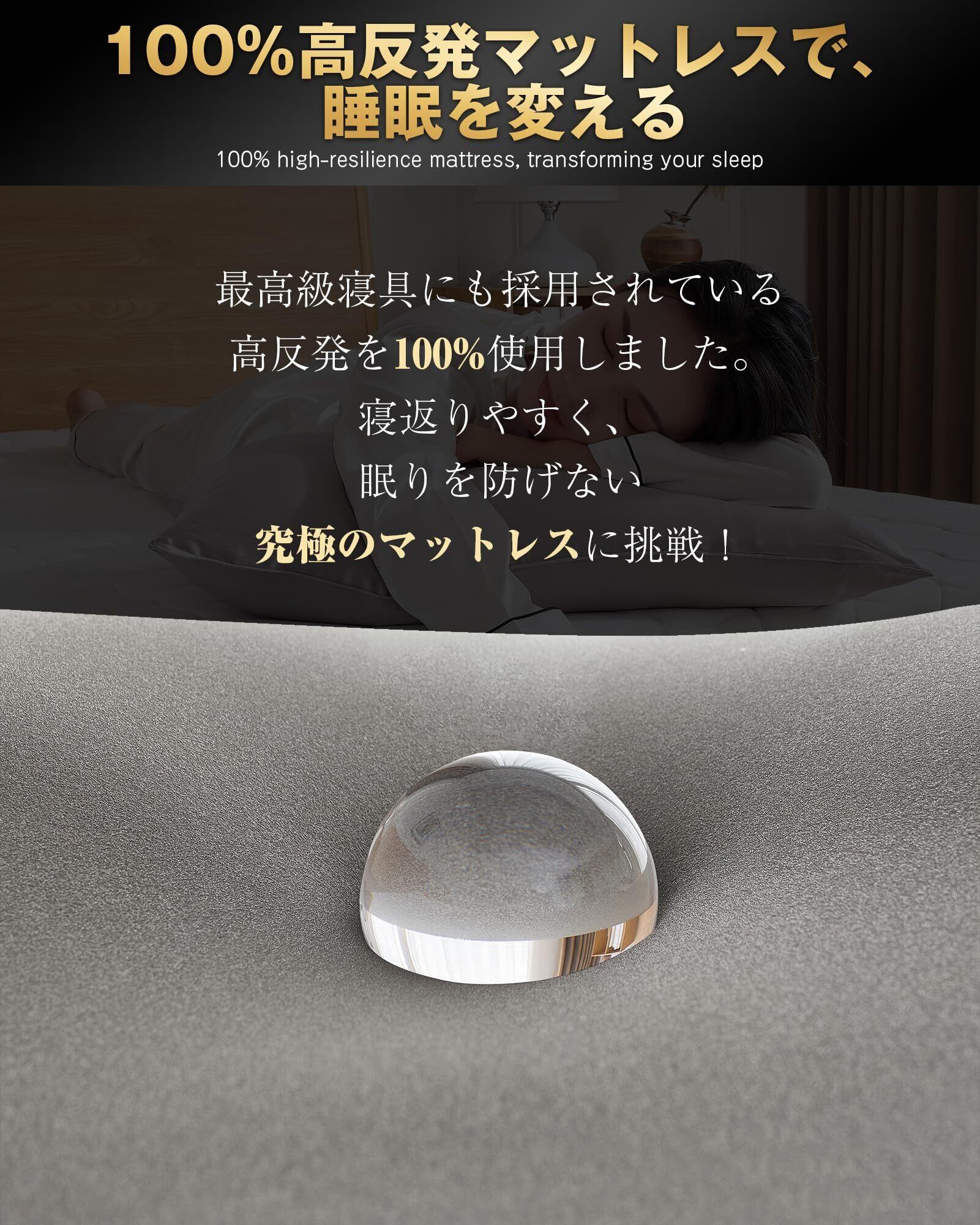 【高反発を100%採用】最高級寝具にも採用されている高反発を100%使用しました。寝返りやすく、眠りを防げない究極のマットレスに挑戦!超・体圧分散で、横向きでも肩に負担がかからなく、仰向けで体にぴったりフィットします。
