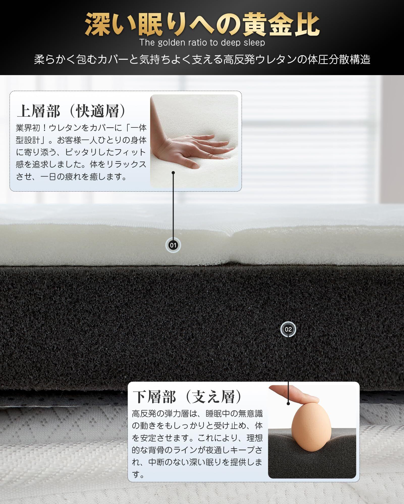 【業界初!高密度層×高反発層のW構造】高級ホテルの睡眠を、ご自宅で!1cm柔らかく包むカバーと気持ちよく支える5cm高反発ウレタンのW構造。業界初の1cm高密度ウレタンを使用されたカバーが、心地よさのポイント!ふわっともっちりの新感覚を実現。