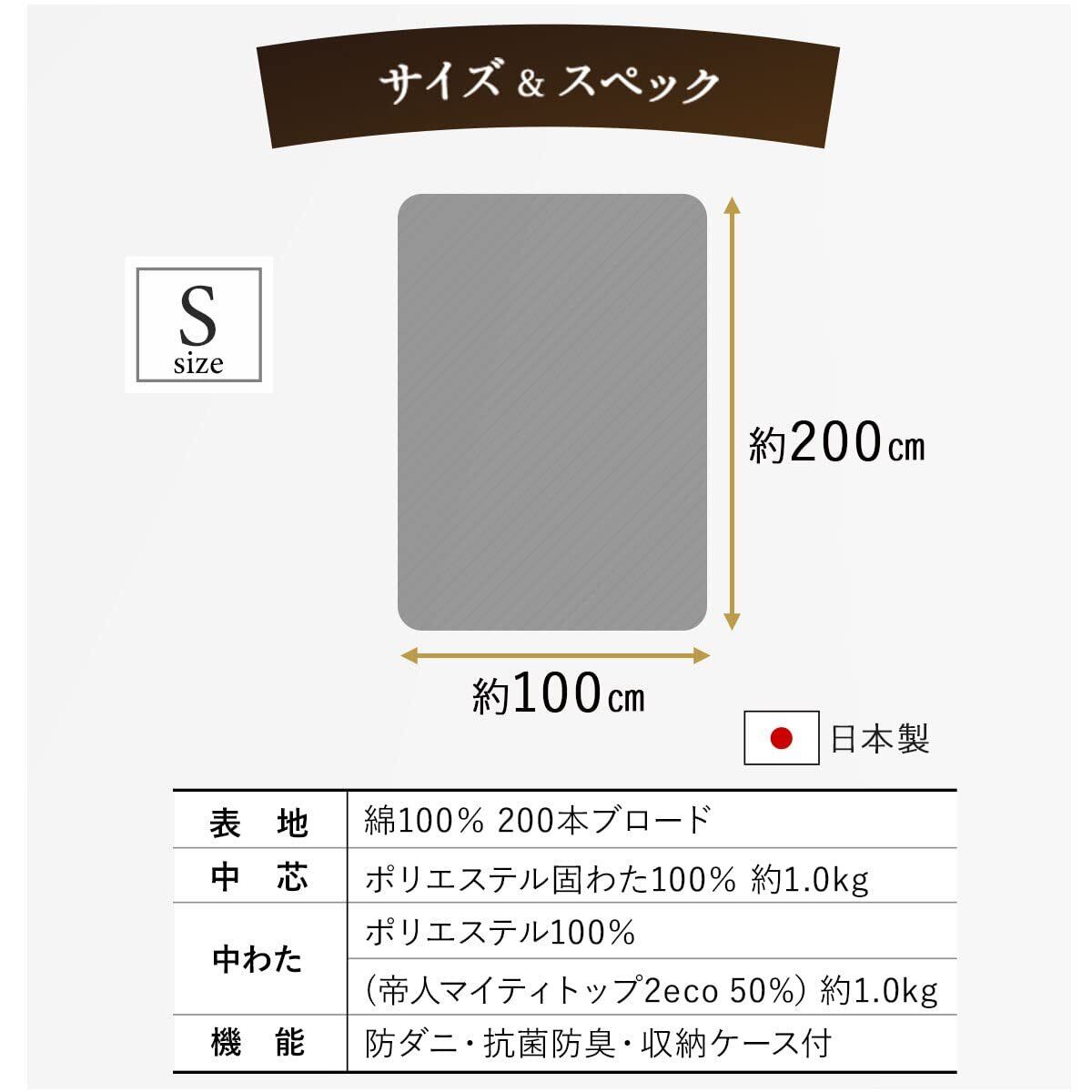 【素材】巻きわた:ポリエステル100%(うち抗菌防臭防ダニわたの帝人マイティトップ2が50%)1.0kg、中芯:ポリエステル固わた100% 1.0kg、生地:綿100%200本ブロード