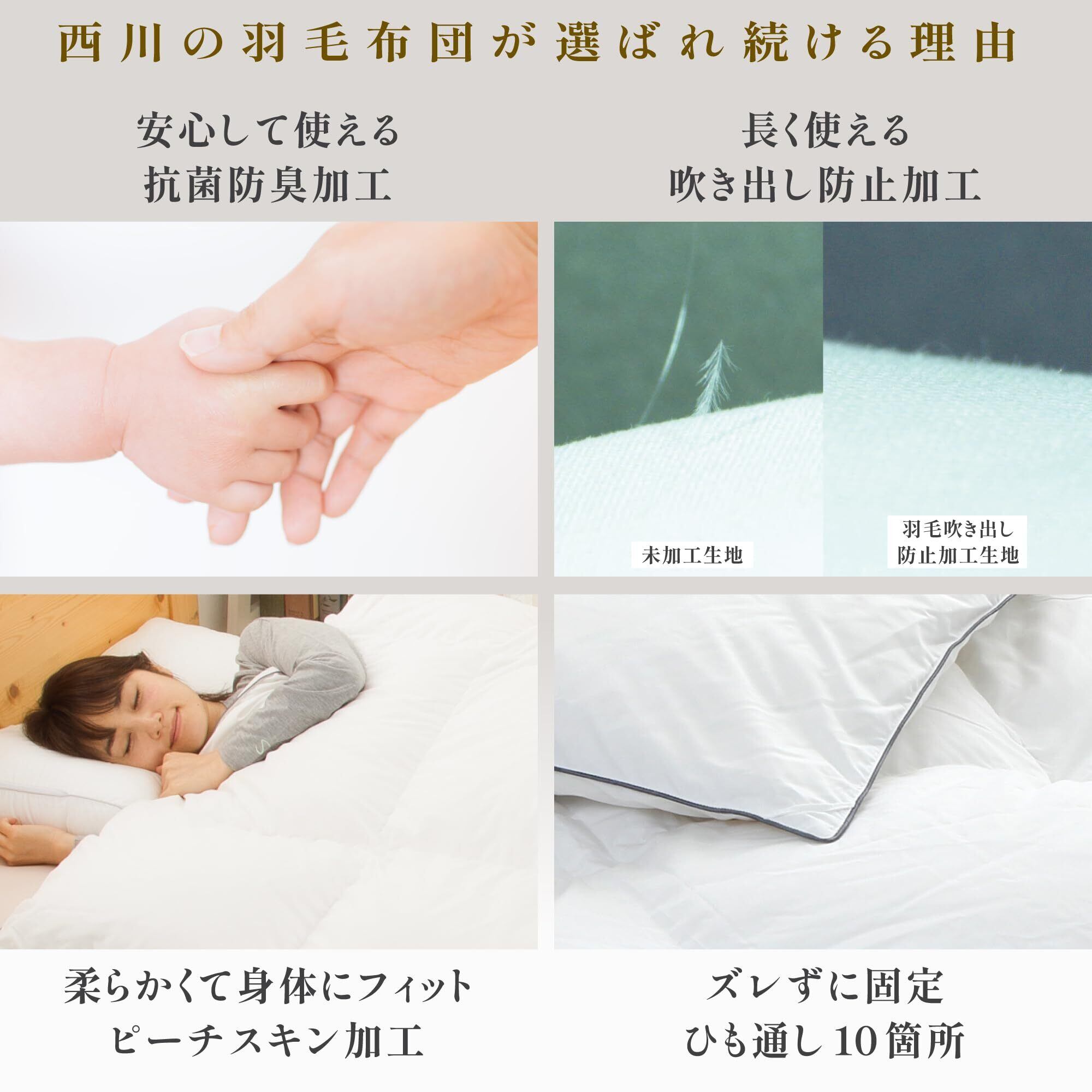 こだわりの日本製。国内の羽毛基準より厳しい西川基準をクリアした、洗練された羽毛だけを使用しています。