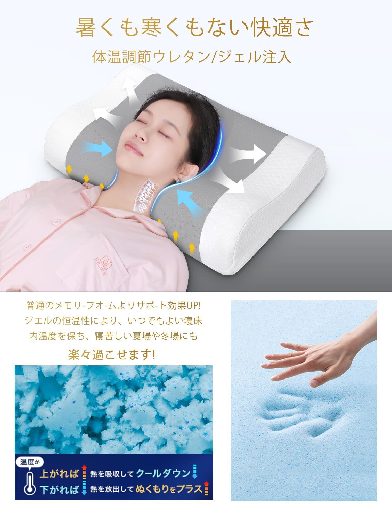 【ジェル注入された体温調節フォーム、朝まで爽やかに】独自の相変化材料ジェル注入!外気温に応じて吸熱/放熱実現できる枕! 真夏でも真冬でも理想の睡眠温度~革新的なカット裁断技術を採用して、首の負担を軽減し、頭の重さを線で支えて分散するので、通気性を高めるとともに、均等に圧力を分散でき、圧迫感が大幅に軽減されます。分割構造が中身の偏りを防ぐため、ウレタンフォームの復元性の高さに加えて、寝返りを打っても常にベストな高さをキープし、首や頭を支えます。やさしく包み込まれるような寝心地、疲れを癒してくれます。理想の寝心地のために開発した枕、快適な眠りを誘います。