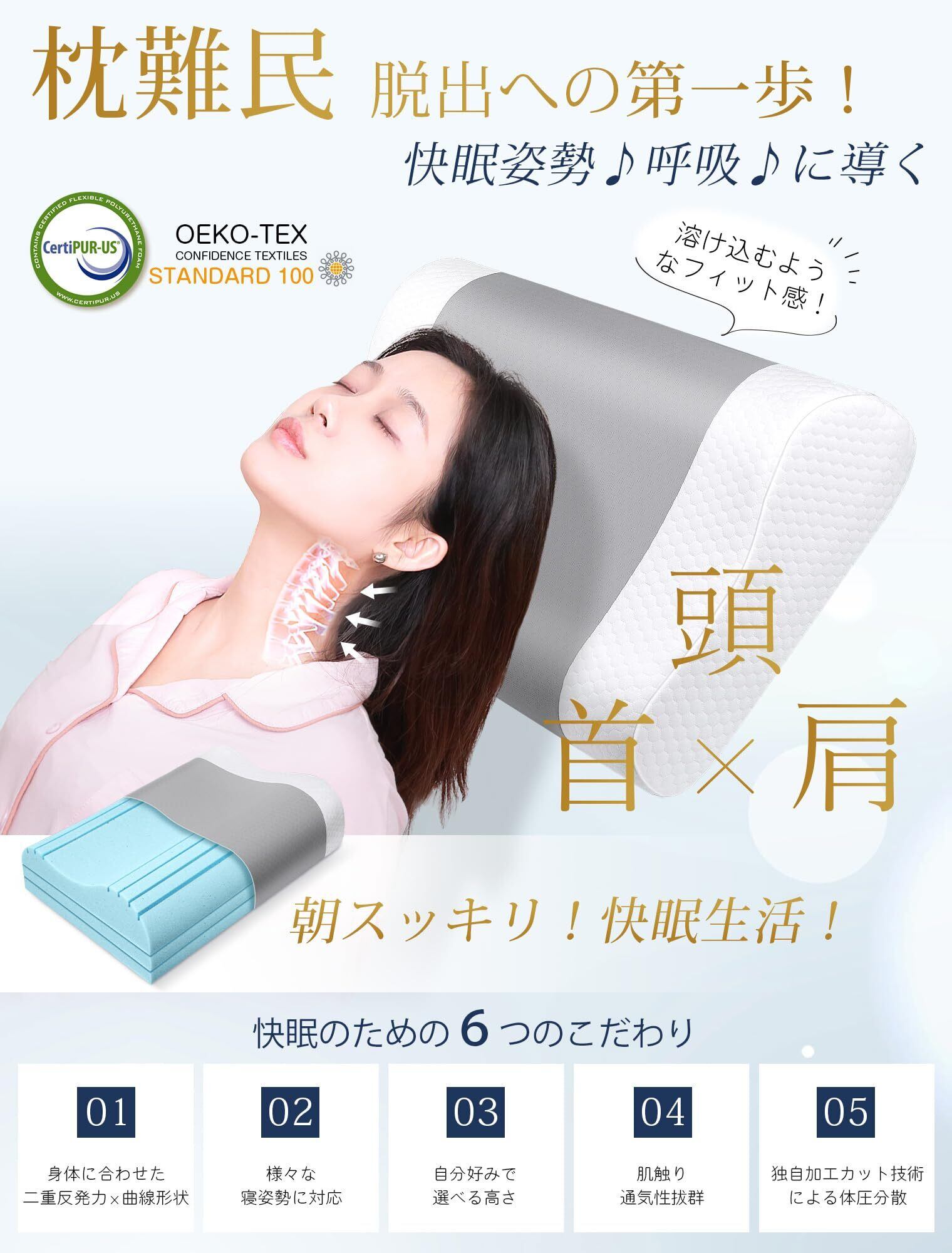 この枕は、低反発素材を使用し、頭と首をしっかりとサポート。包み込むような感触が特徴で、特に首の痛みを感じる方にぴったりです。仰向け、横向き、うつ伏せ寝でも安定した寝姿勢をキープします。