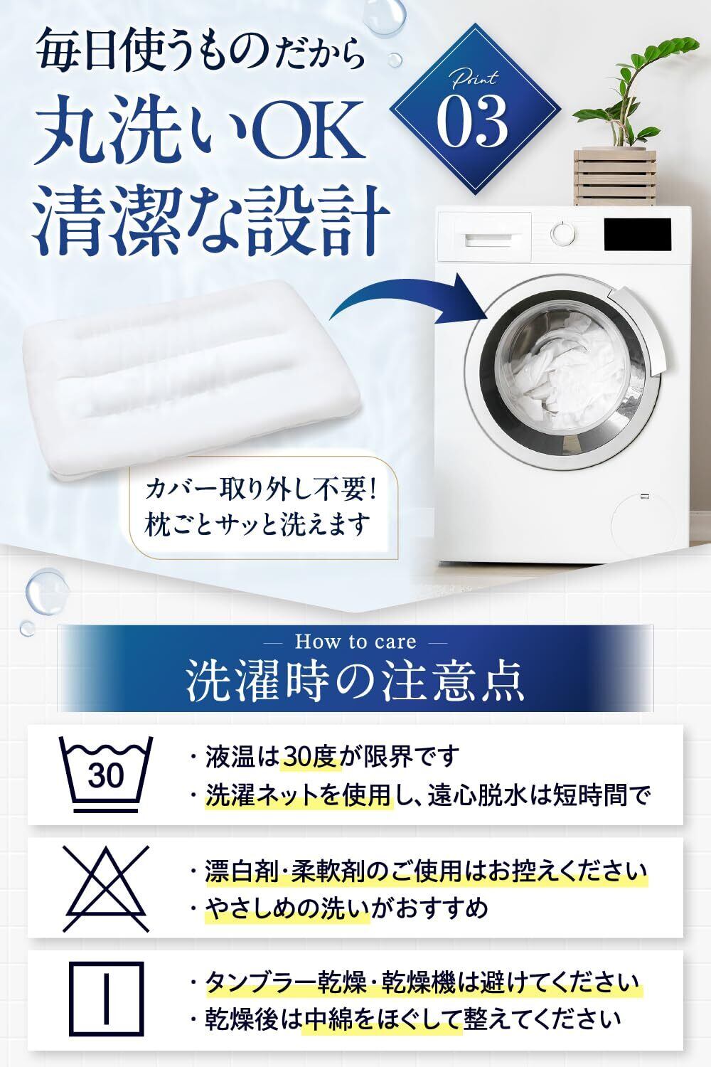 【洗濯機で丸洗いOK・衛生的で安心】 毎日の眠りは“清潔さ”から。洗濯カバーをつけ製品を洗える丸洗い仕様で、汗や皮脂、ダニの心配を軽減します。ホルムアルデヒドゼロ・防ダニ・抗菌仕様だから、清潔感が気になる方にもおすすめ。いつでも気持ちよく、清潔な眠りをお届けします。