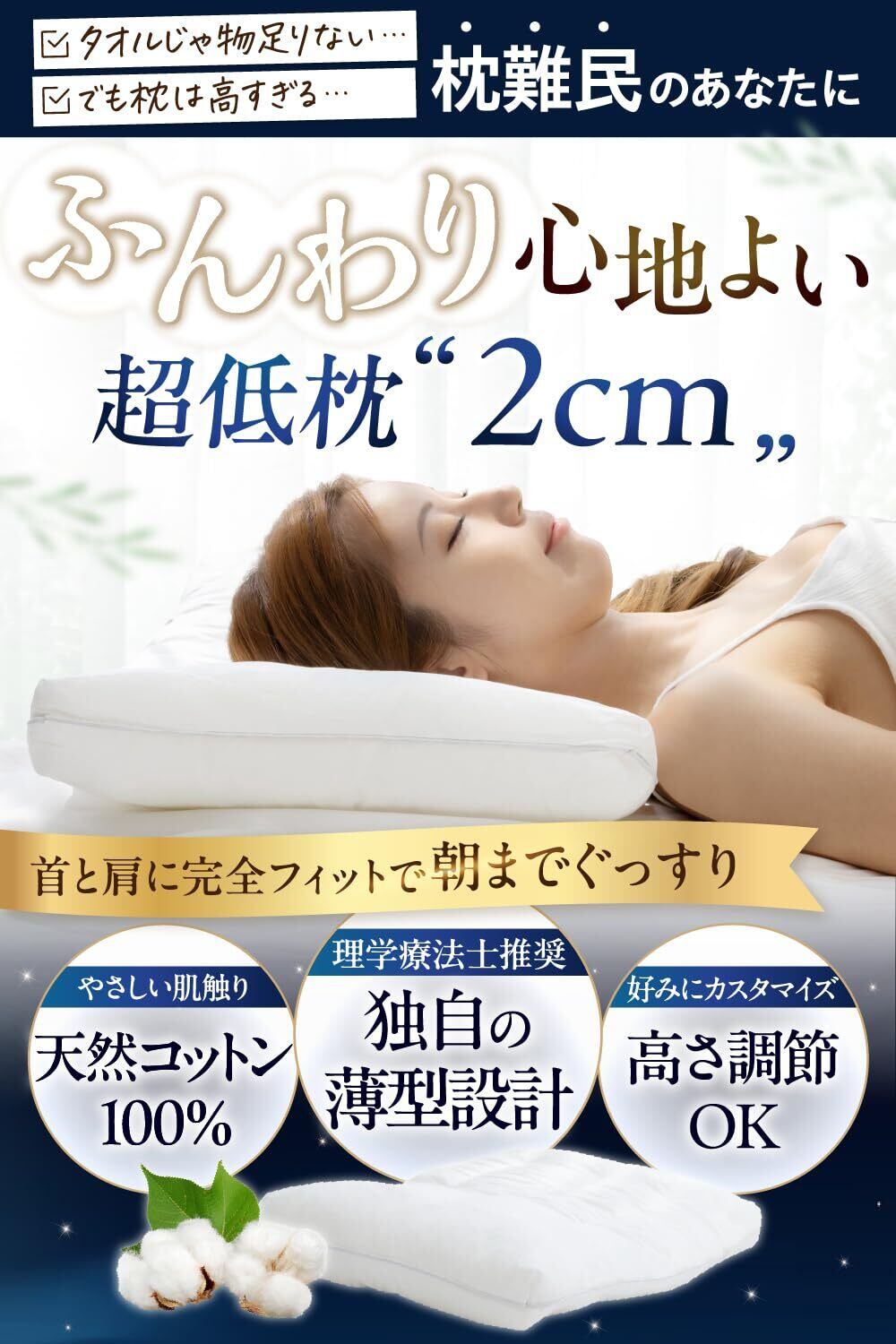 快眠研究所【理学療法士監修】超スリム2cm 睡眠まくら 首や肩の負担を減らす 枕 低め 低い枕 薄い枕 薄い 洗える 柔らかい枕 通気性 高さ調整 天然コットン (40×60cm/超スリム2cm)