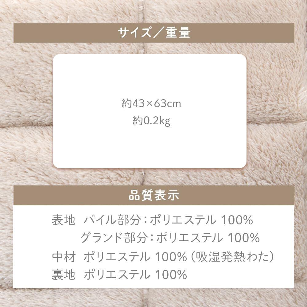 材質 表:毛羽部分:ポリエステル100%(フランネル長毛マイクロ330g/m2) グランド部分:ポリエステル100% 中綿:ポリエステル100%吸湿発熱綿 裏:メッシュ ポリエステル100% トリコットヘム、ゴム付き