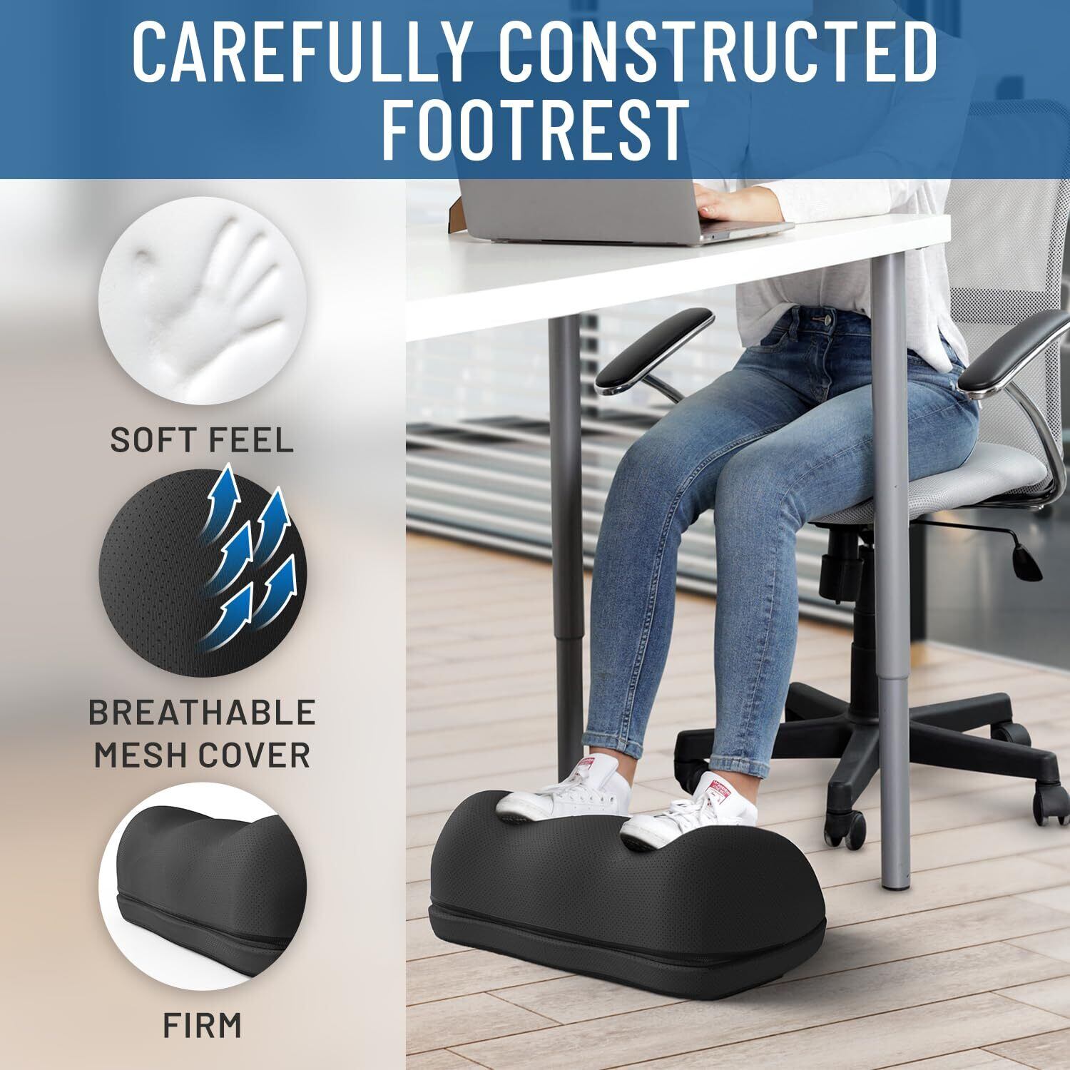 Everlasting Comfort FootCloudフットレストアンダーデスクで座り心地を高めましょう。オフィスでの使用に。長時間座っているときの不快感に対抗する究極のソリューションです。 プレミアムメモリーフォーム製。デスク下のフットレストは、オフィスで足にぴったりとフィットし、パーソナライズされたサポートと比類のない快適さを提供します。 その革新的なデザインは、下半身と足の痛みをターゲットにするだけでなく、血行と姿勢を大幅に改善します。 これにより、疲労や不快感が顕著に軽減され、オフィスワーカー、ゲーマー、長時間座っている人にとって理想的なパートナーになります。 デスク下のフットレストは、快適さだけにとどまらず、汎用性と利便性を追求したデザインです。 3-in-1機能により、標準的なフットレストとして使用したり、軽く揺れる動きで脚をアクティブに保つことができます。また、心地よいマッサージノードを備えた取り外し可能なベースを利用してリラックスできます。 高さ調節機能により、フィット感をカスタマイズでき、脚と足を完璧に揃えて最適な快適さを提供します。 さらに、涼しく通気性のあるカバーと掃除しやすいデザインで、人間工学に基づいたデスク下のフットレストにより、手間をかけずに快適さを維持できます。 職場でも自宅でリラックスしても、デスク下用の調節可能なフットレストは、座り心地、健康、幸福の1つに変えます。 デスク下のフットスツールは、自宅での仕事の必需品です。 所有できる重要なワークデスクアクセサリーの1つです。