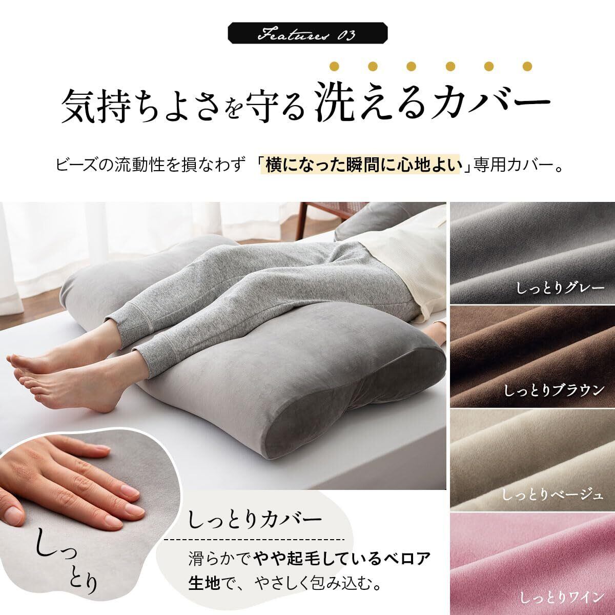 Point.3 気持ちよさを追求したカバー 通常のカバー生地では固すぎて、ビーズの流動性が殺されてしまいがちです。 マシュマロアッパーピローは横になったときに気持ちいいと感じるマシュマロ生地を採用。 ずっと触っていたくなる極上のもちもち触感と寝心地が至福の睡眠へと誘います。