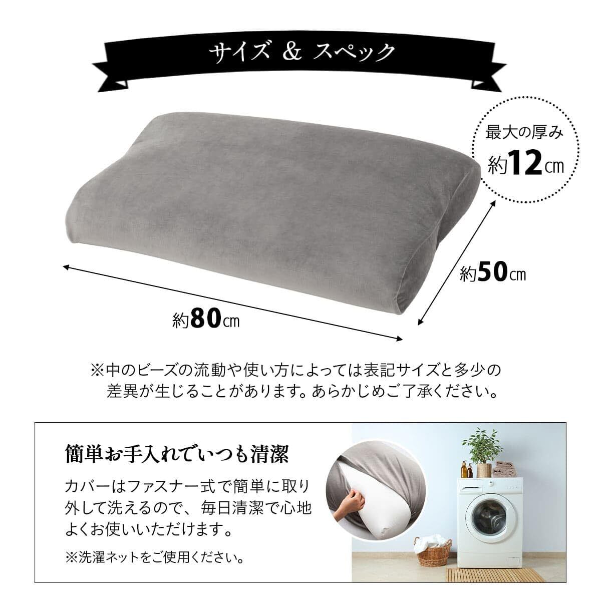 「エムール マシュマロフットピロー」は、日本製の高品質な極小ビーズを使用しており、リラックスした睡眠をサポートする優れたアイテムです。幅約80㎝のデザインで使い勝手も良く、様々なシーンでの使用が可能です。