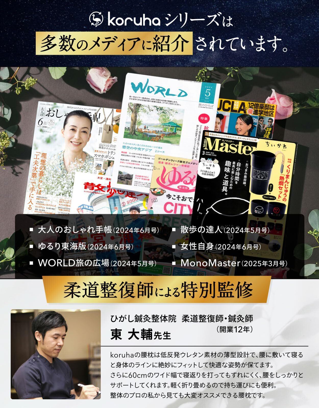 【 身体のプロが本気で開発 】柔道整復師、鍼灸師、開業12年の東大輔先生による特別監修,推薦していただいております。 【 一晩中腰椎をサポート 】 高さ3センチの設計で、背骨を無理に反らさず自然な姿勢を保ちます。また、寝返りを妨げず、横向き寝でも圧迫感を感じさせません。広い60センチのサイズで心地よい眠りを実現し、座りっぱなしで腰が辛い方や、丸まった腰が気になる方にも向いています。