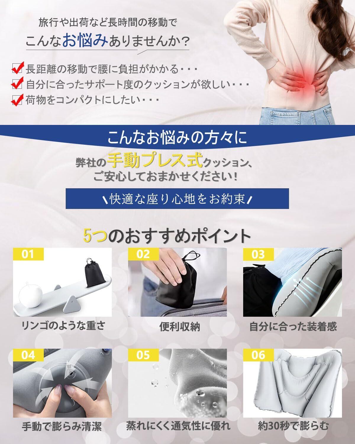 【旅のくつろぎ】携帯しながらも快適さを両立させた腰枕です。通常時は片手で握れるサイズに収納できるため、持ち運びが簡単で携帯性に長けています。使用する際には口を使わず、手動で簡単にお好みの膨らみ具合に調整できる、便利なアイテムです。海外旅行の飛行機内、国内旅行の観光中、あるいは長時間夜行バスに乗る場合など、腰痛で困っている方にどこでもくつろぎを届けてくれる、まさに旅に欠かせない快適グッズです。