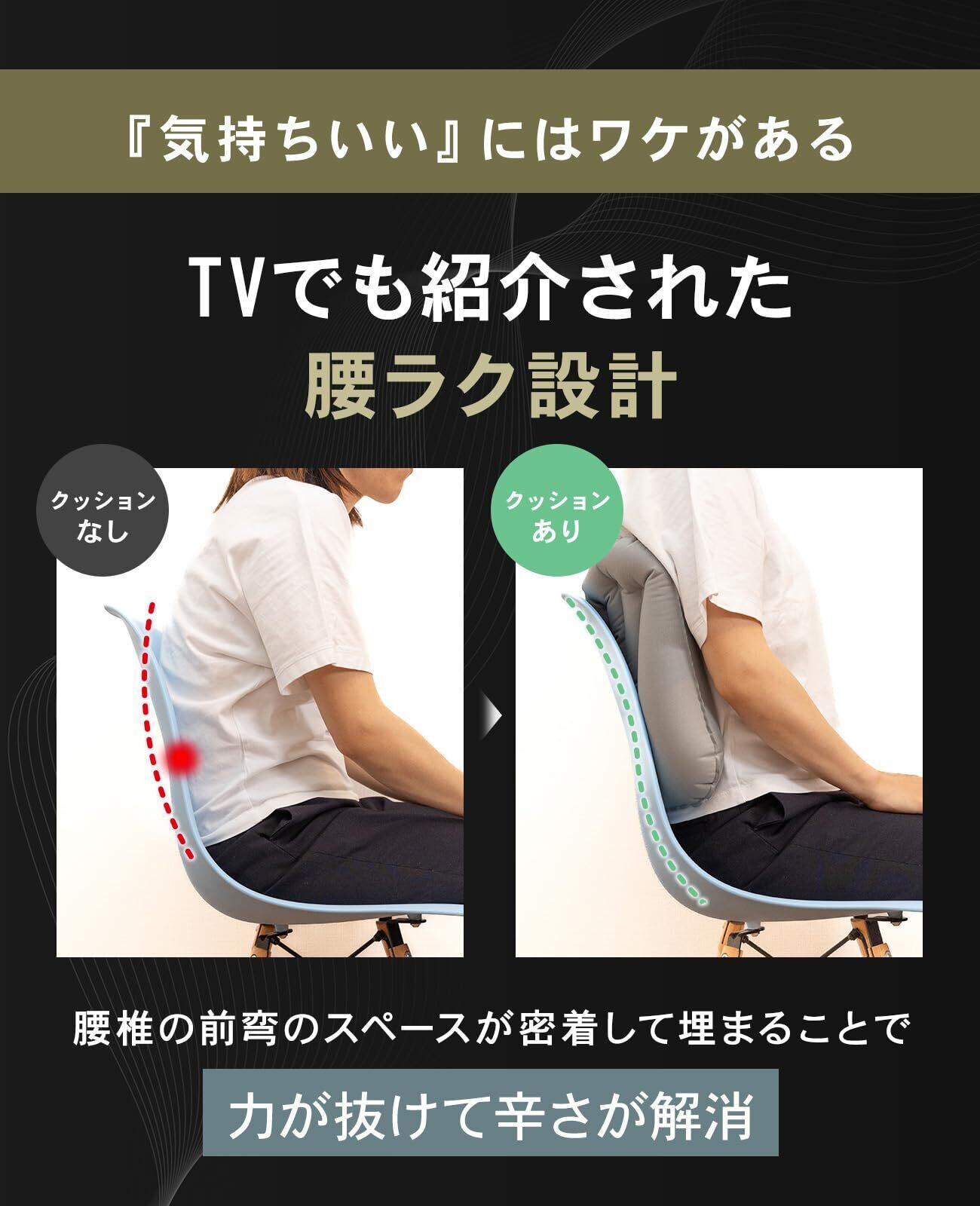 特殊なクッション構造が腰の形にフィットし、体圧を分散します。カーブしたデザインにより、背骨を自然な位置に保ち、疲れにくい姿勢を維持します。オフィスや自宅でも使えるため、普段使いにも優れたアイテムです。