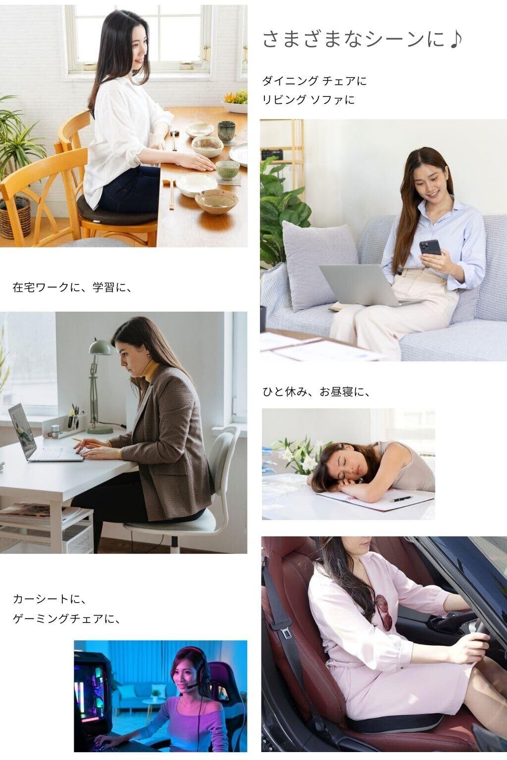 このクッションは、オフィスチェアや自宅のソファ、車のシートなど、さまざまな場所でご利用いただけます。背中や腰をしっかりサポートし、快適さを追求したアイテムです。