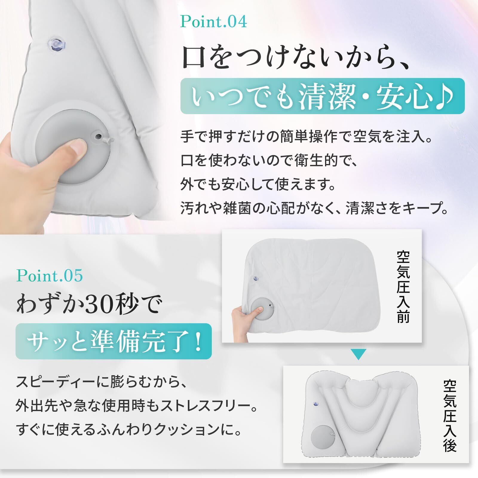 【押すだけ簡単!30秒でサッと準備完了】面倒な準備は一切不要!手で押すだけの簡単操作で、クッションがふんわりと立体的に膨らみます。わずか30秒で使用可能なので、移動中や急な使用時にもストレスフリー。空気の調整も自由自在だから、あなたにぴったりの座り心地をその場でカスタマイズできます。