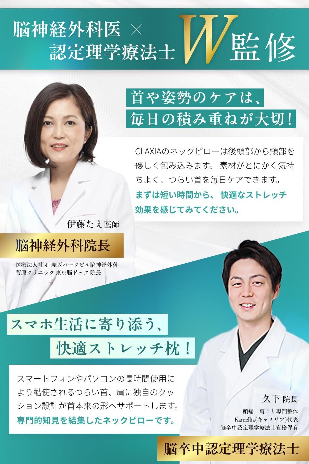 【専門家2名による監修】 脳神経外科院長と認定理学療法士の監修を受けたモデルで、日々酷使される首に快適なサポートを提供します。専門家の知識を活かし、首や肩に負担をかけずにストレッチが可能となる独自のカーブ設計により、快適な使用感を実現しました。日常的なストレッチに最適な製品です。