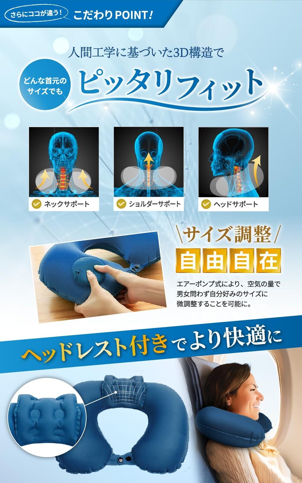 【ヘッドレスト付きでより快適に】人間工学に基づいた3D設計により、よりフィット感がUP。首の位置が合わない時は空気の出し入れで微調整が可能。合わない時は裏にしてボタンをつけることで、収納も可能に。