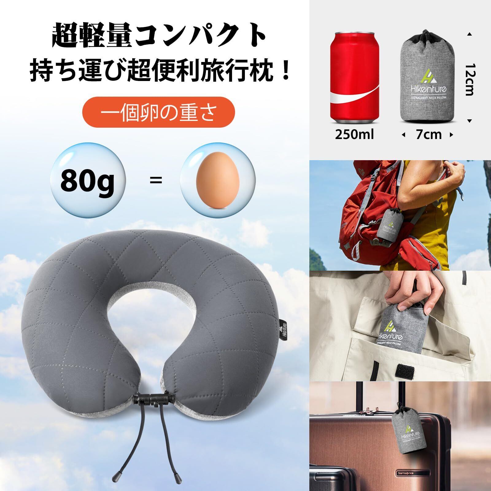 【手のひら収納サイズ:12✖7CM】超軽量コンパクトHIKENTUREネックピローは一個の卵とほぼ同じ重さ、僅か80g、使わないときはコンパクトに折りたためるので荷物にならない、軽量で持ち運ぶのもラクチン。専用収納ケース付き、「出張や旅行にネックピローを携帯したいけど荷物が増えるのはイヤ」という悩みがある方に本商品オススメです。