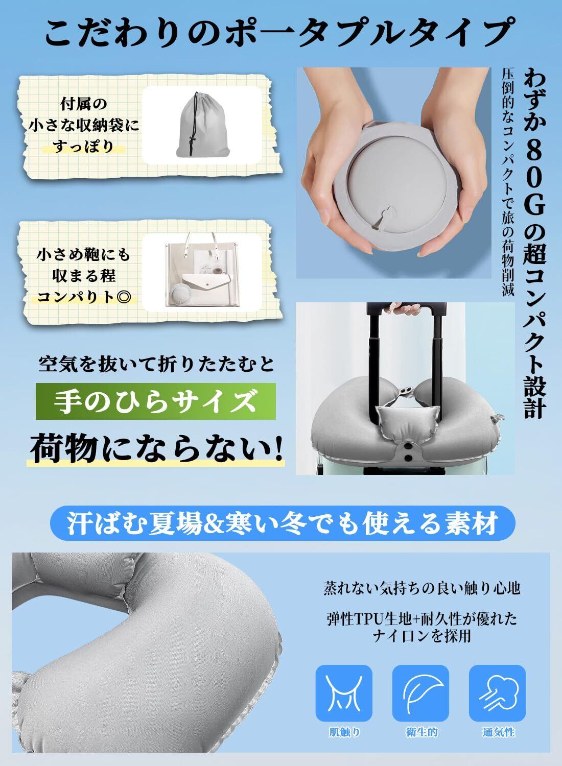 【超軽量&コンパクト】エアータイプで畳むと手のひらサイズに収まるほどコンパクトに。携帯枕重さも約80g、荷物が嵩張らず、快適な移動や旅をお楽しみいただけます。