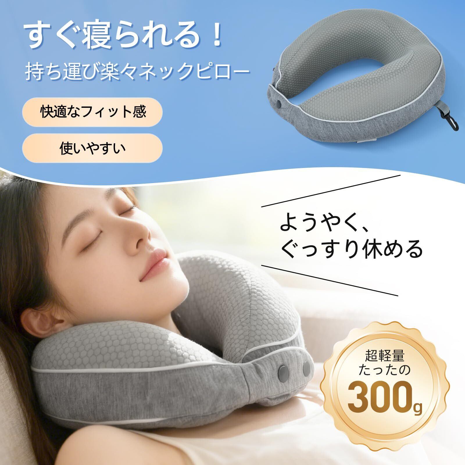 【超軽量コンパクト設計】 重量はわずか300g、同類品より20~30%軽量、バックパッカーやビジネス層に適す。力を入れて巻き込めばコンパクトに折りたためるので、持ち運びにも便利です。飛行機や深夜バスでの仮眠に最適です。折り畳み時サイズ約17cm×17cm、専用の収納ボックスが付きます。