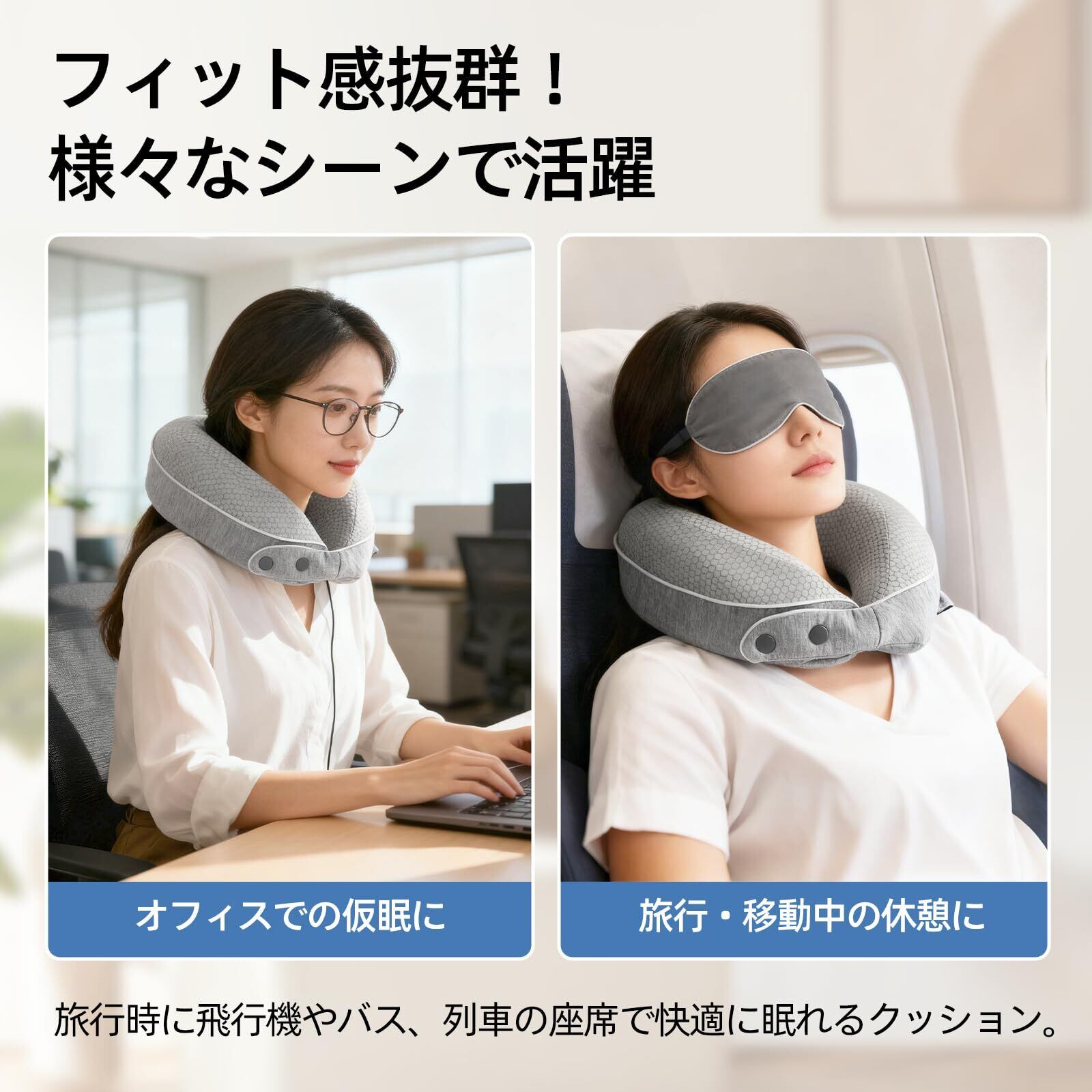 【旅行・自宅・オフィスの3大シーン】 移動時:飛行機や夜行バスの狭い座席でも首の負担を軽減します。 自宅用:ソファでテレビを見る時や昼寝時の「スマホ首」予防に効果的です。 仕事中:デスクチェアと組み合わせて、長時間座り作業による肩こりを改善します。