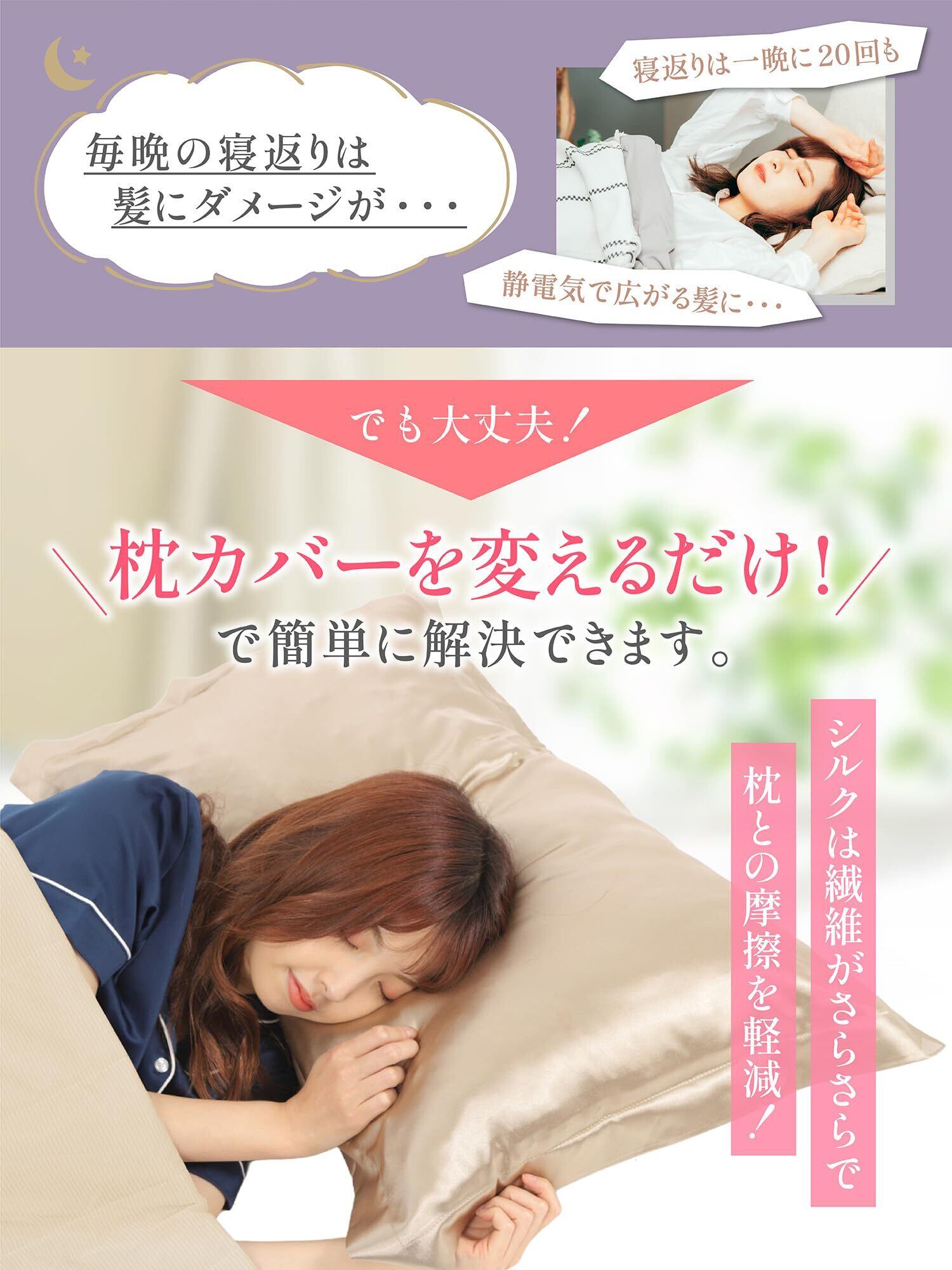 【寝ながらヘアケア】シルク枕カバーに含まれるタンパク質は、枝毛・縮毛・曲がり・乾燥を最小限に抑え、髪と髪の摩擦を軽減する効果があります。シルク枕カバーは長く使っていくうちに、髪が段々柔らかく滑らかになって光沢がでてきたりと髪質改善を実感できます。睡眠中のヘアケアアイテムとして、シルク枕カバーは大人気です。