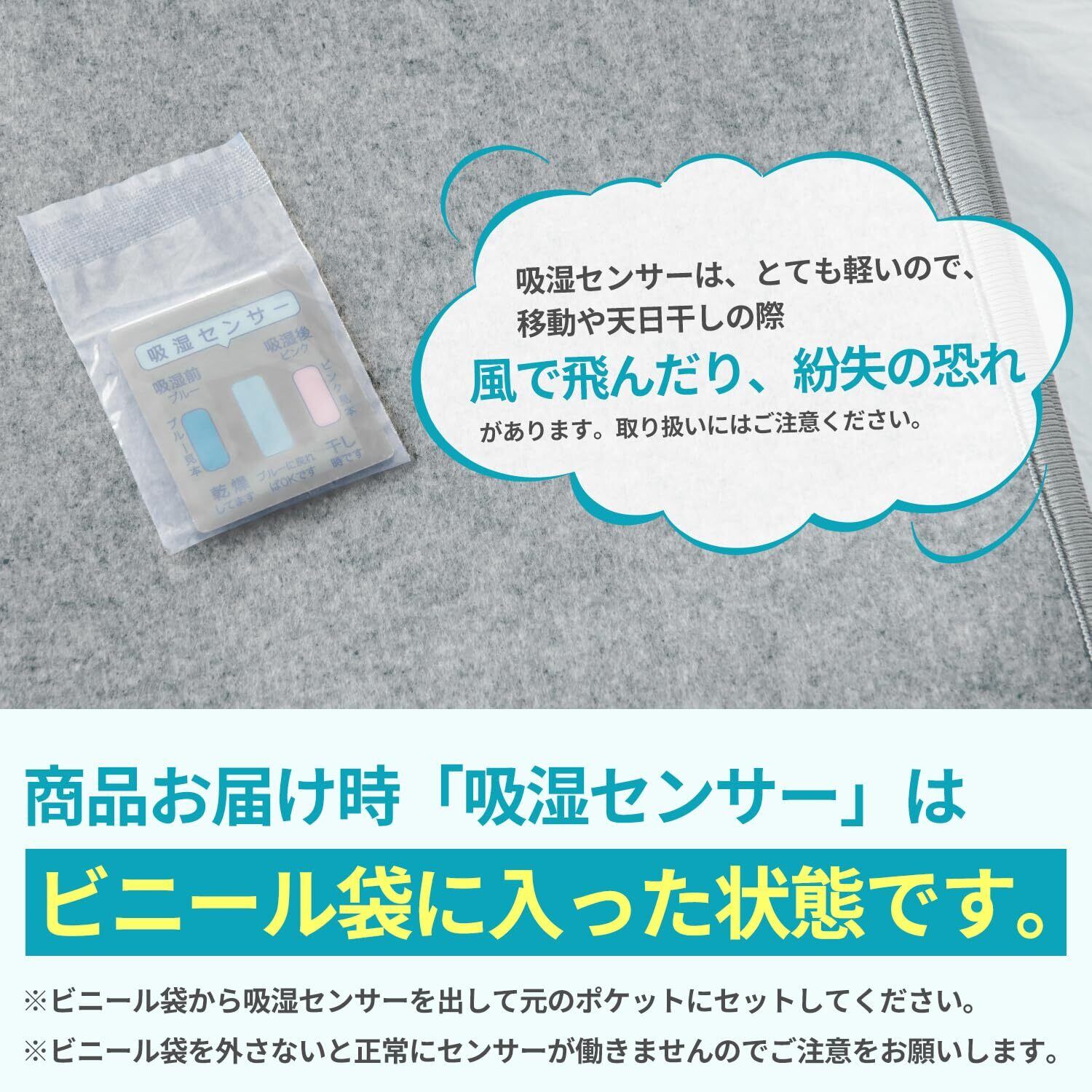 【お手入れ簡単&経済的】吸湿センサー付きで、干し時が一目でわかります。センサーがブルーからピンクに変わったら、風通しの良い場所で干すだけで再び使用可能に。くり返し使えるので、経済的でエコ。さらに、本体はご家庭で丸洗いできるため、いつでも清潔に使用できます(※洗濯前にセンサーを取り外してください)。