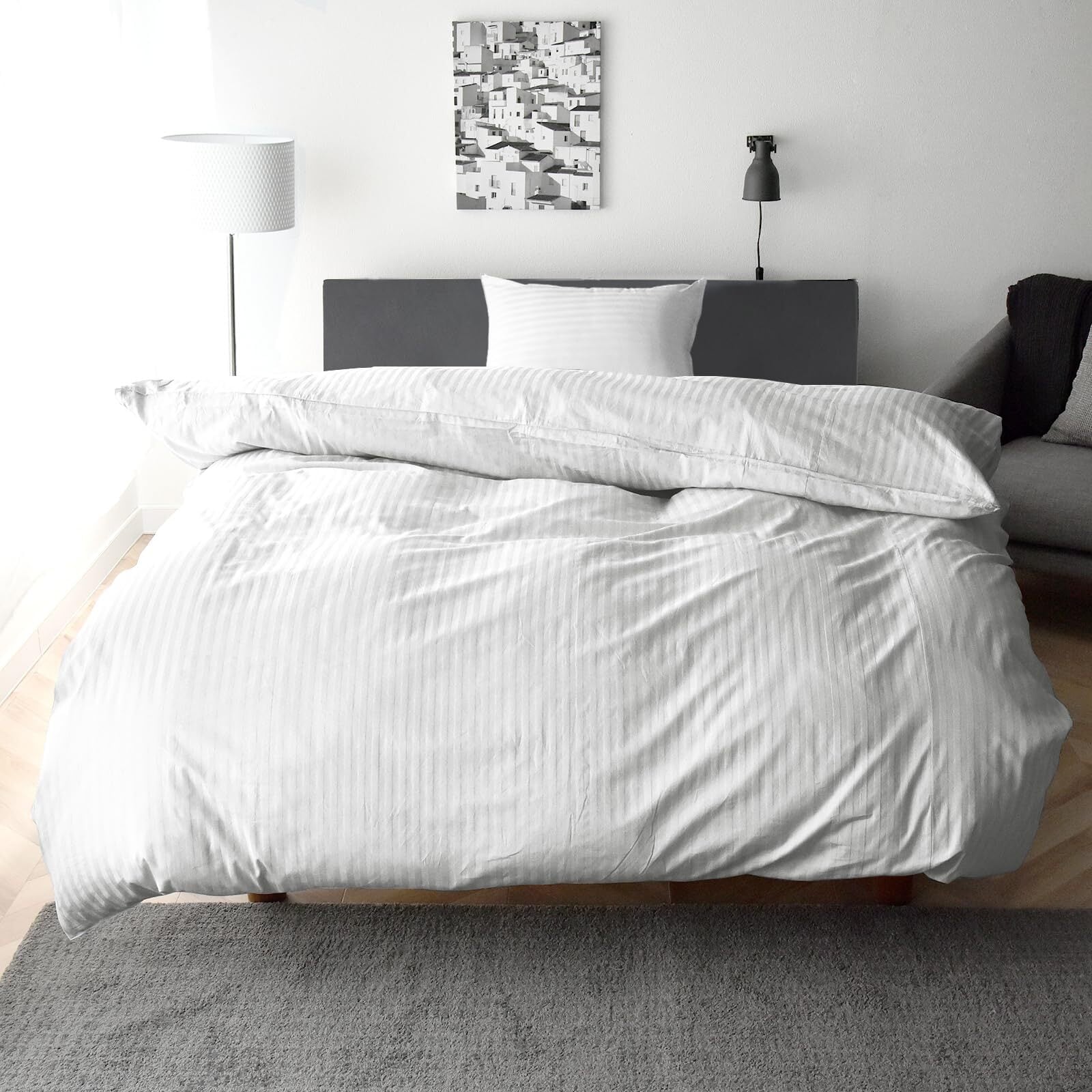サテンストライプのデザインが施されたセットは、北欧風のテイストを加え、お部屋にスタイリッシュな印象を与えます。シンプルながらもおしゃれで、インテリアのアクセントに最適です。