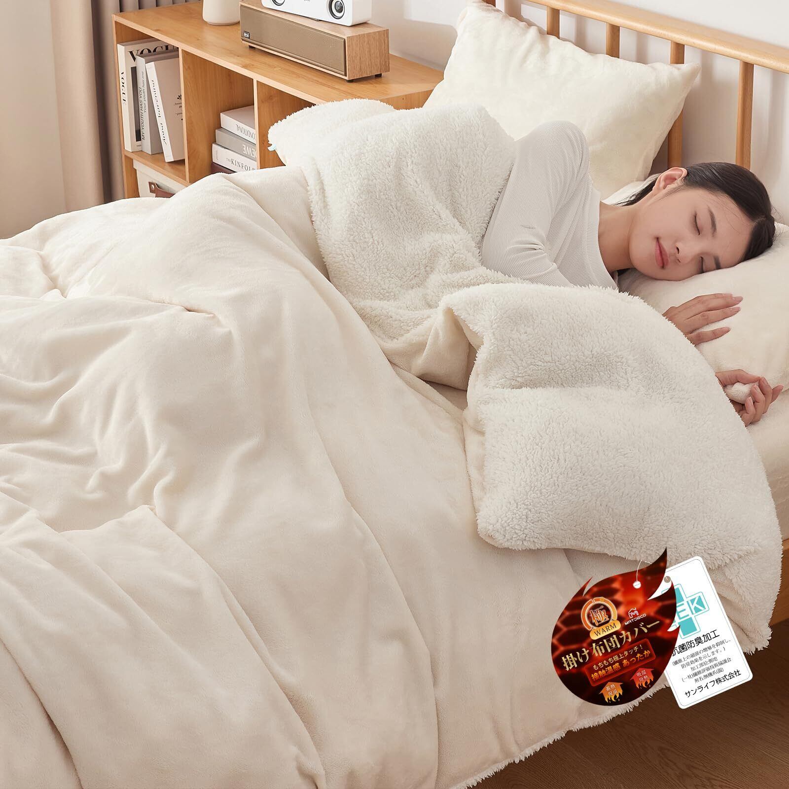 fuwawa 掛け布団カバー シングル 冬 フランネル&シープボアー リバーシブル あったか 暖かい 布団カバー 極細マイクロファイバー 毛布カバー 吸湿発熱 ふわふわ 蓄熱保温 接触温感 毛布にもなる 快適 静電気防止 簡単着脱 全開ファスナー&防止スナップボタン付き 無地 単品売り シングル 150×210cm アイボリー
