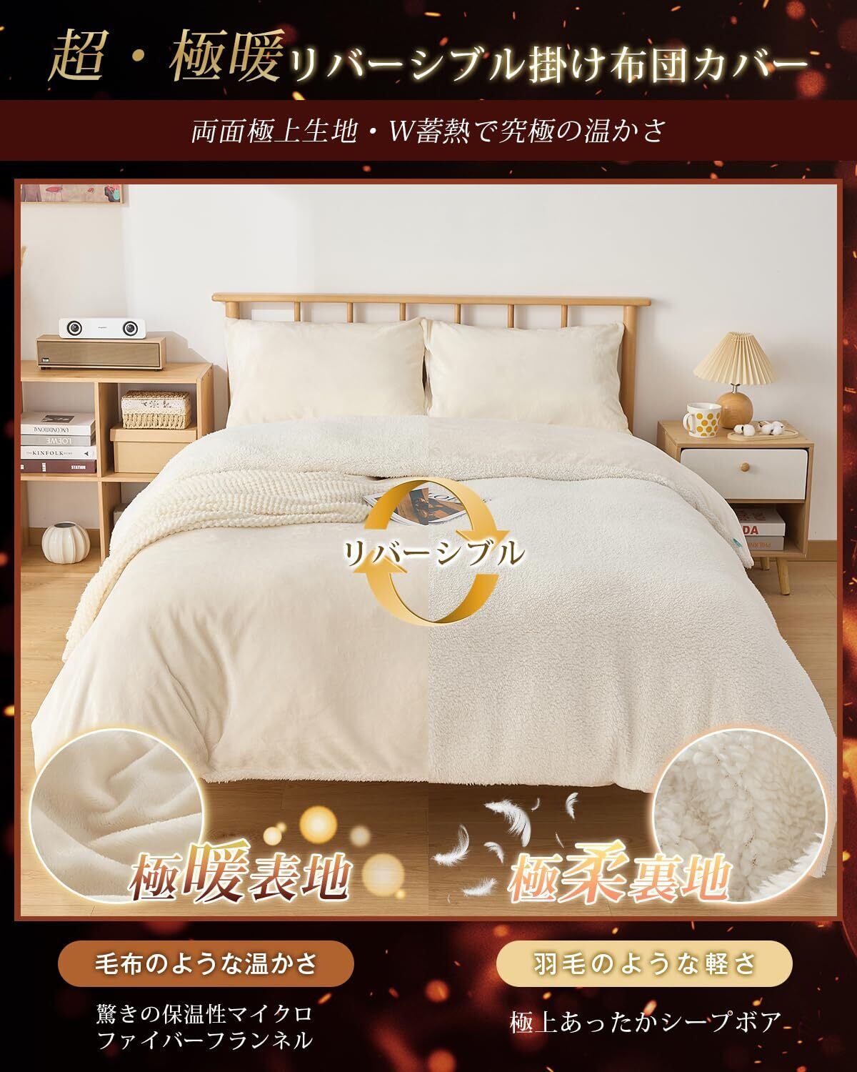 【リバーシブル ふんわりとろける肌触り掛け布団カバー】 表側は、「羽毛のような軽さ」と「毛布のような温かさ」を兼ね備えたプレミアムフランネル生地を使用。繊細なマイクロファイバーが空気の層を作り出し、体温を逃がさず効率的に保温します。ふんわりとした厚みとなめらかな肌触りで、寝返りを打っても絡まりにくく、快適な寝心地を実現しています。 裏側は、冬の寒さに負けない極厚シープボア仕様。羊毛のようなふわふわの肌触りが、就寝時からぽかぽかの温もりで包み込み、冷え知らずの安眠をお約束します。 一枚で二通りの快適さを楽しめるリバーシブル設計で、季節や気分に合わせて使い分けが可能。冬の寝室を贅沢な温もりと優雅な雰囲気で彩る、こだわりの掛け布団カバーです。