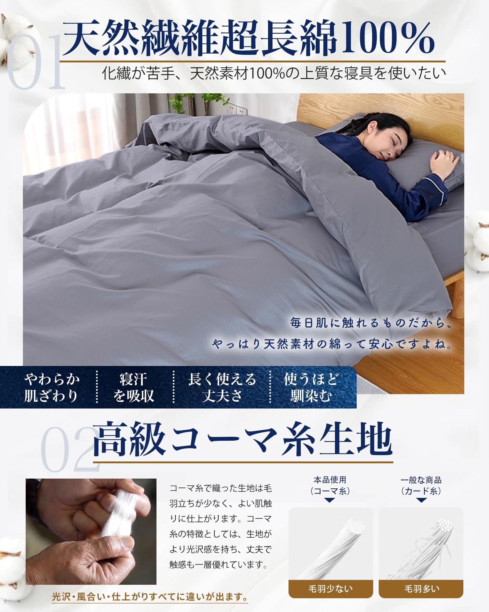 【高級超長綿100%使用・掛け布団カバー シングル 綿100】コットンの繊維の長さにより、短・中・長繊維綿と分類されています。長さが平均35㎜以上の特に長いものを「超長綿」と呼びます。超長綿でさらに加工し、毛玉の原因となる余分な部分を取り除き、毛羽立ちが少なくに仕上がった高級「コーマ」糸になります。上質なコットン100%天然素材であるコーマ糸で織られた掛け布団カバーは、めん素材ならではの吸湿性、通気性に優れ、一年中サラッと快適に過せます。また、静電気が発生しにくく、ポリエステル混紡では味わえない天然素材の柔らかさと肌触りを提供します。さらに、抗菌防臭性に優れたプラチナ(白金)を組み合わせることで、抗菌・防臭機能も持続します。洗濯を重ねるほどに柔らかくなり、肌に馴染む使い心地が特徴です。