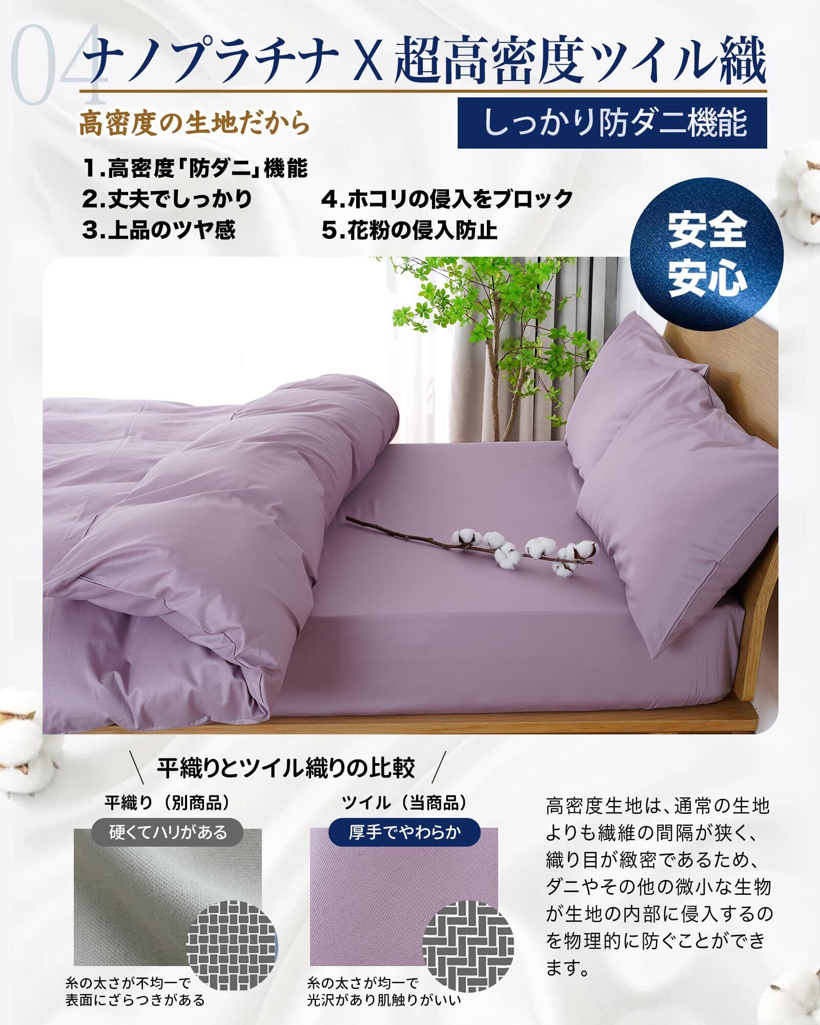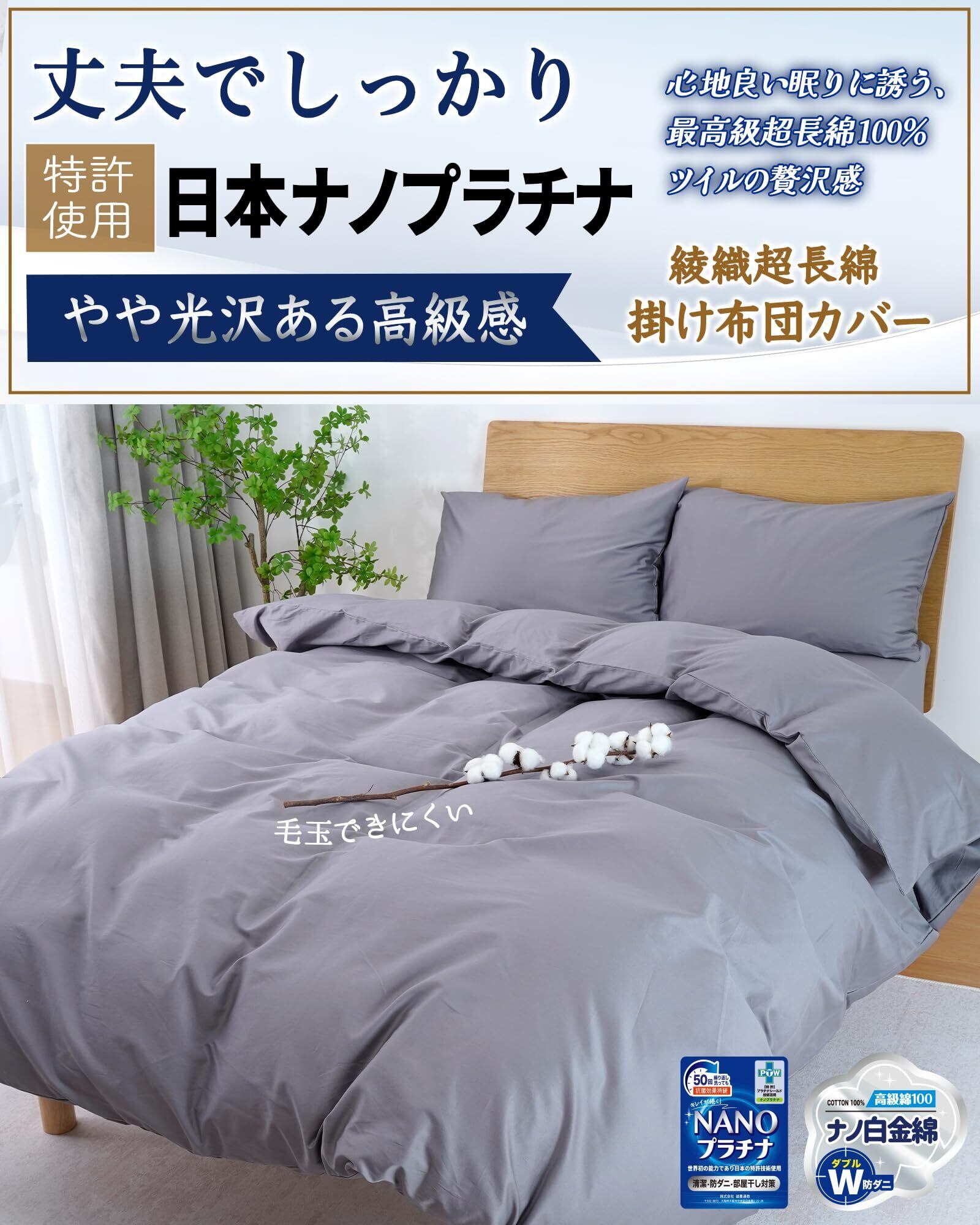 【日本ナノフラチナ使用技術】抗菌・防臭・防ダニ機能を最大限に発揮!ナノプラチナは、最先端技術により微粒子化し、優れた抗菌·防臭·防ダ二効用を発揮する新しい技術です。日本で生まれたこの革新的な技術を掛布団カバーに贅沢に採用することで、より長時間の清潔効用を持続させ、繰り返し洗濯しても機能を持続いたします。空気中に漂う菌から部屋干し時の濡れた掛けふとんカバーを守ります。ぶとんカバーは湿気の影響を受けやすく、ダニが生息しやすい寝具であるため、ナノフラチナ技術によりダニ対策を強化した構造設計で、睡眠中も防ダ二対策を徹底しましょう。