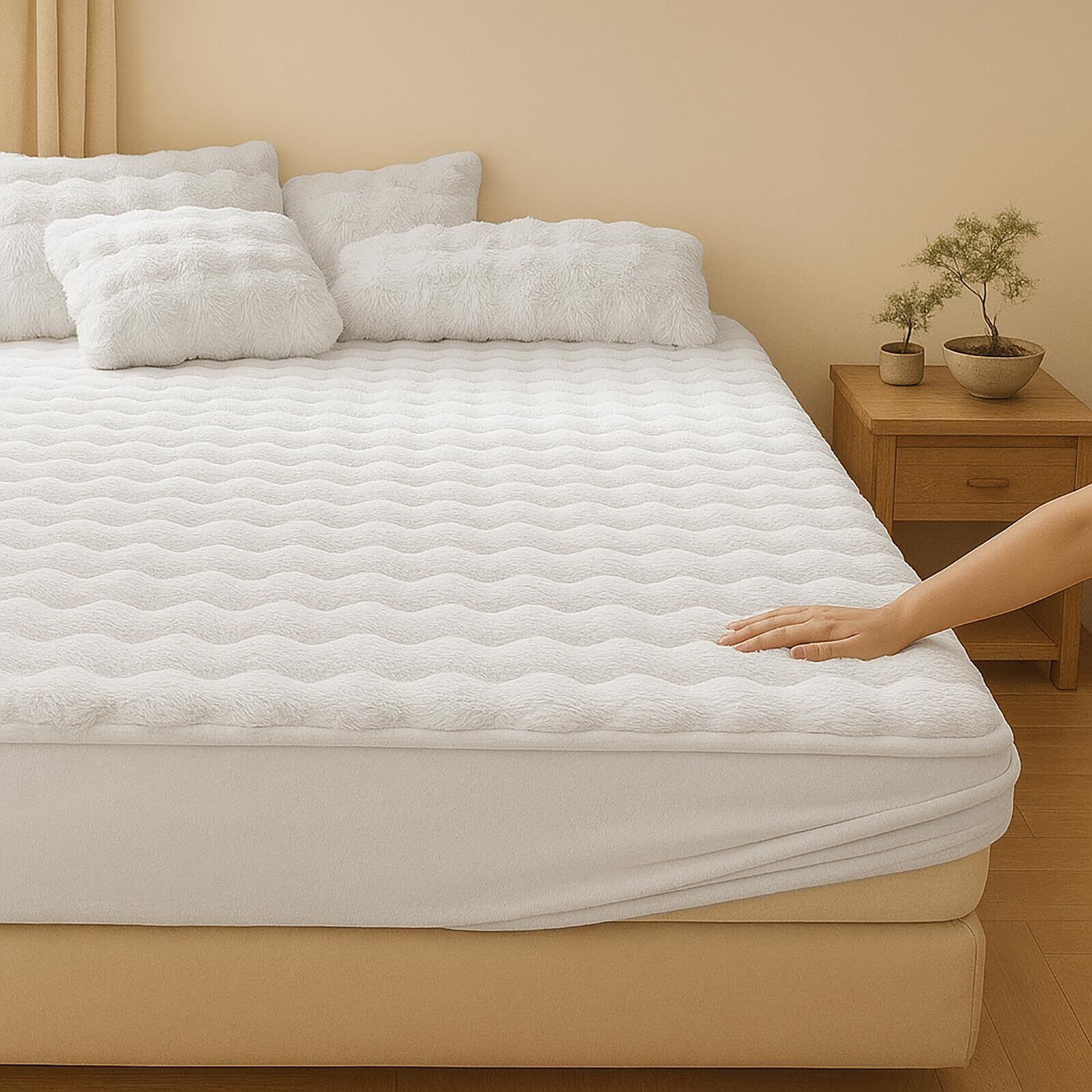 全周ゴム付きのデザインにより、マットレスにしっかりフィットしながらも、脱着が非常に簡単です。忙しい朝でもストレスなく着用でき、寝室を美しく整えることができます。
