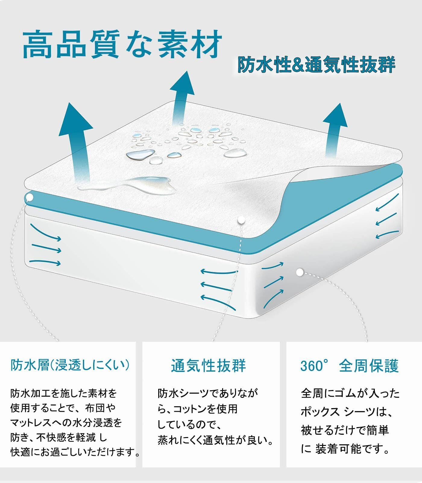 ■【防水性抜群】裏面にはTPU防水膜があり、防水性抜群のボックスシーツです!マットレスへの水分浸透を防ぎ、不快感を軽減し快適にお過ごしいただけます。女性の生理に、子供との添い寝やペットと一緒に寝る時に大活躍。子供のおねしょに、ペットのそそう用、老人の介護に、アレルギーしやすい方に、ニーズに応じて、いろんなシーンで大活躍できます!。