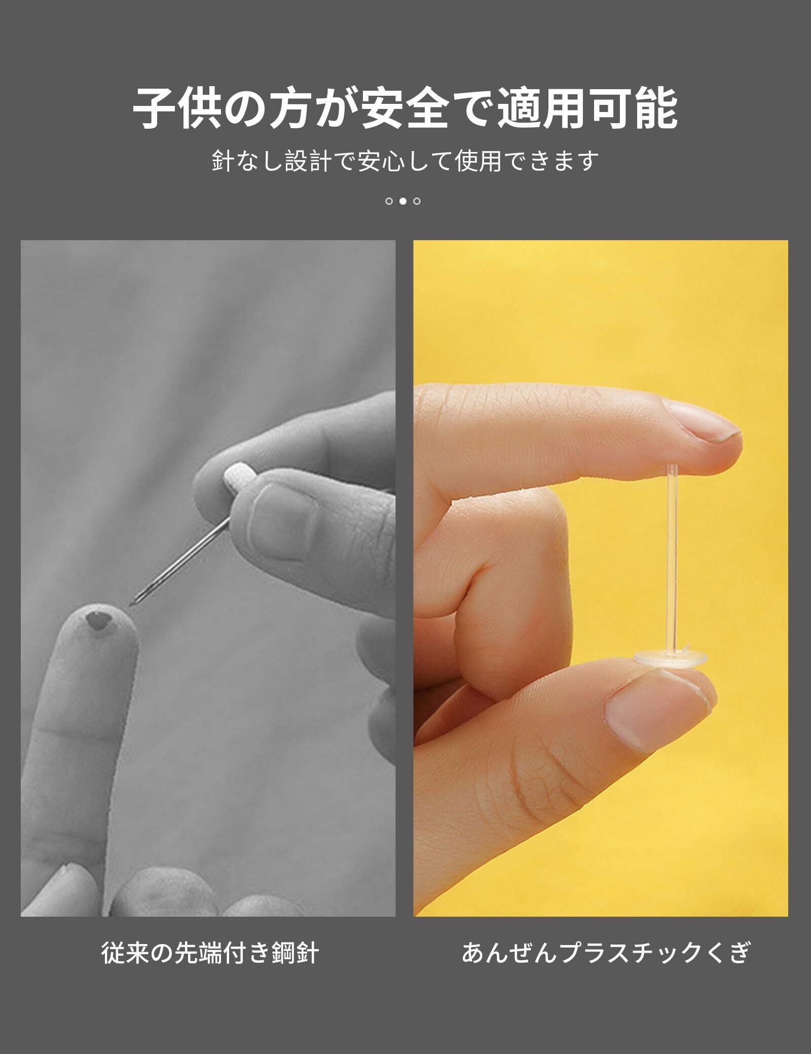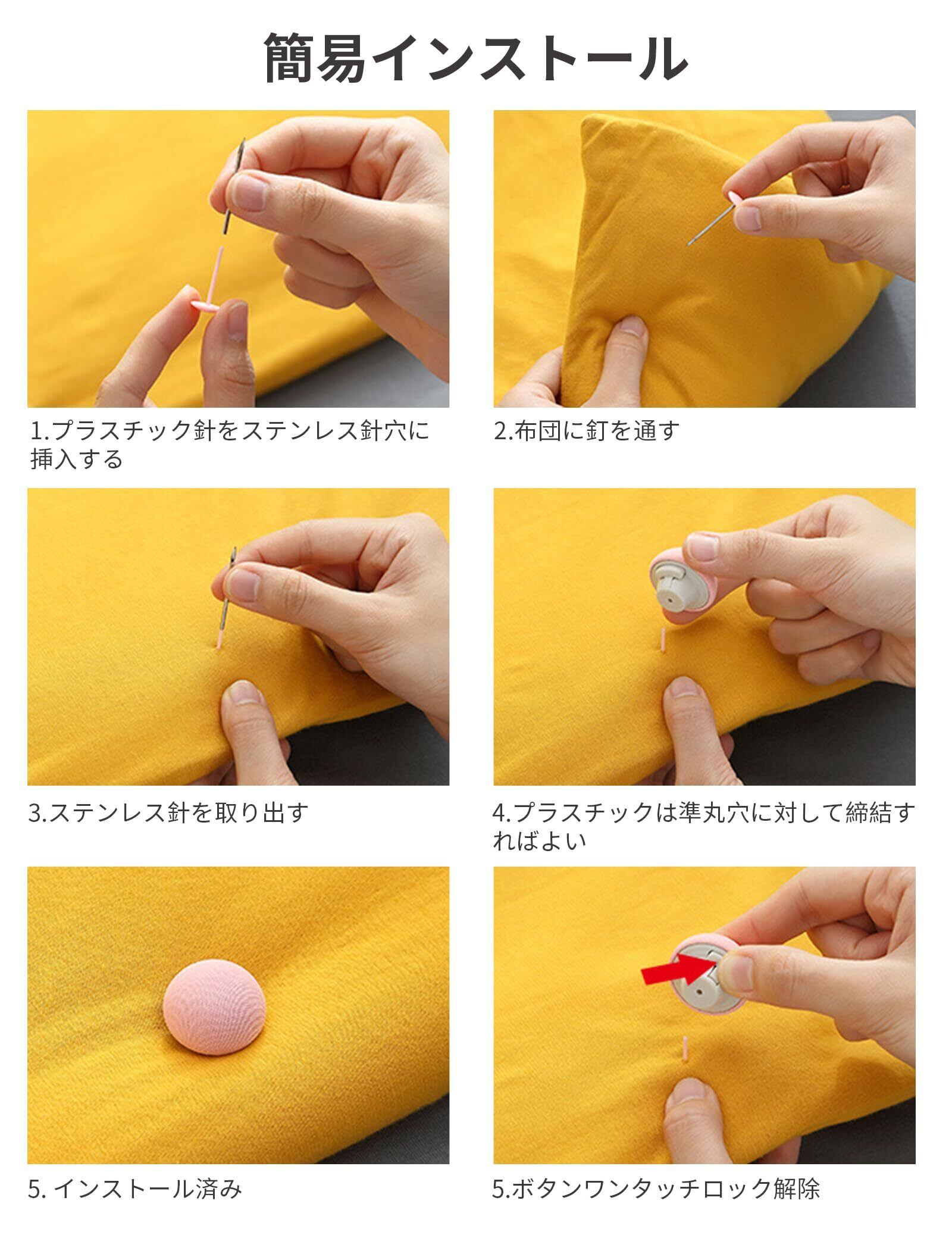 【使い方簡単】ピンをキルトに通して、キノコボタンの丸い穴にピンを差し込むだけで完了です。 外すときは押すだけでロックが解除されます。