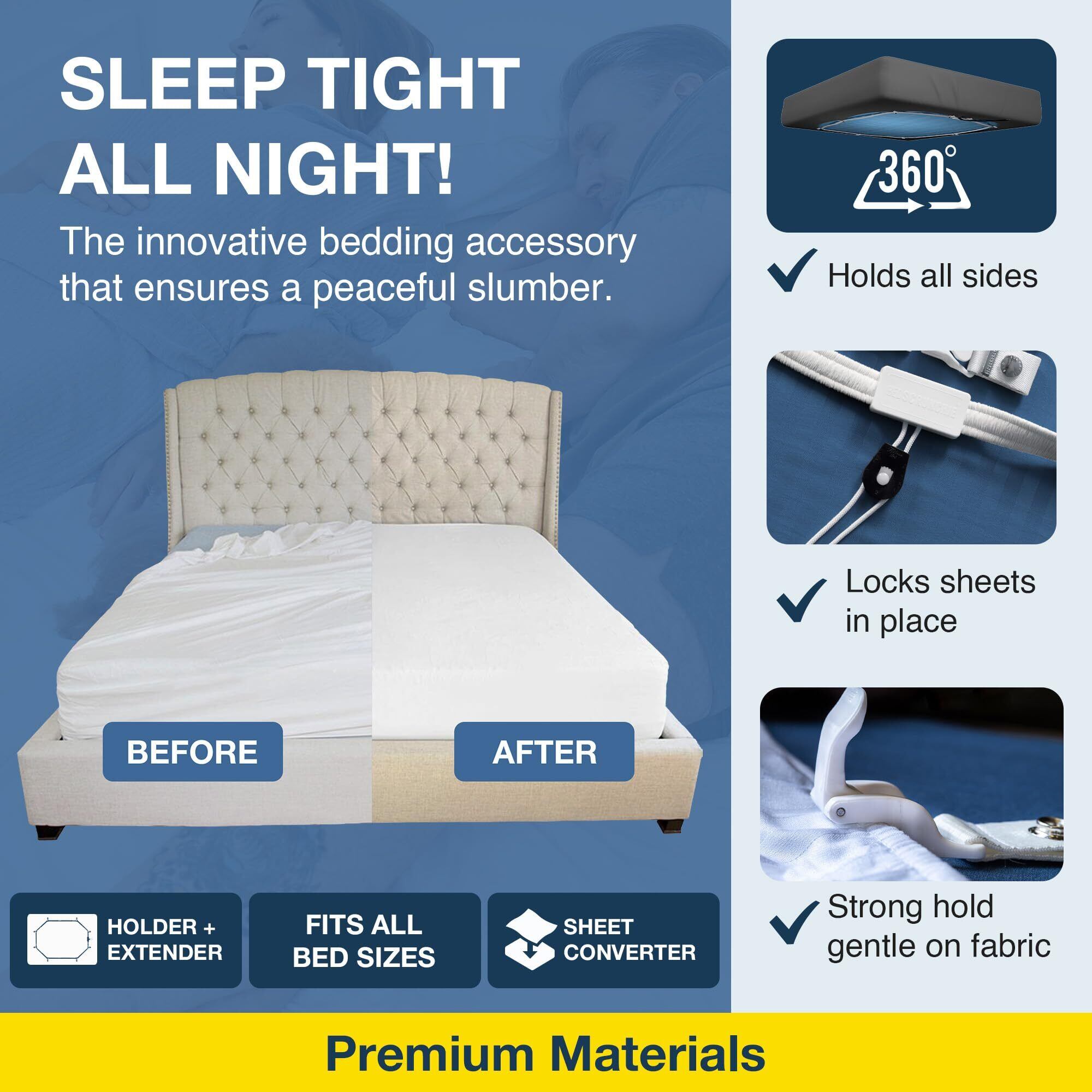 すべてのマットレスタイプにユニバーサルフィット - 世界初の360度ベッドシーツホルダー、エクステンダー、コンバーターをご紹介します。 当社のビーガンフレンドリーなシーツ留めストラップは、4本足の友人に対してもシーツを安全に保ちます。 1日を邪魔するぽっちゃりしたルーズなシーツにさよなら!
