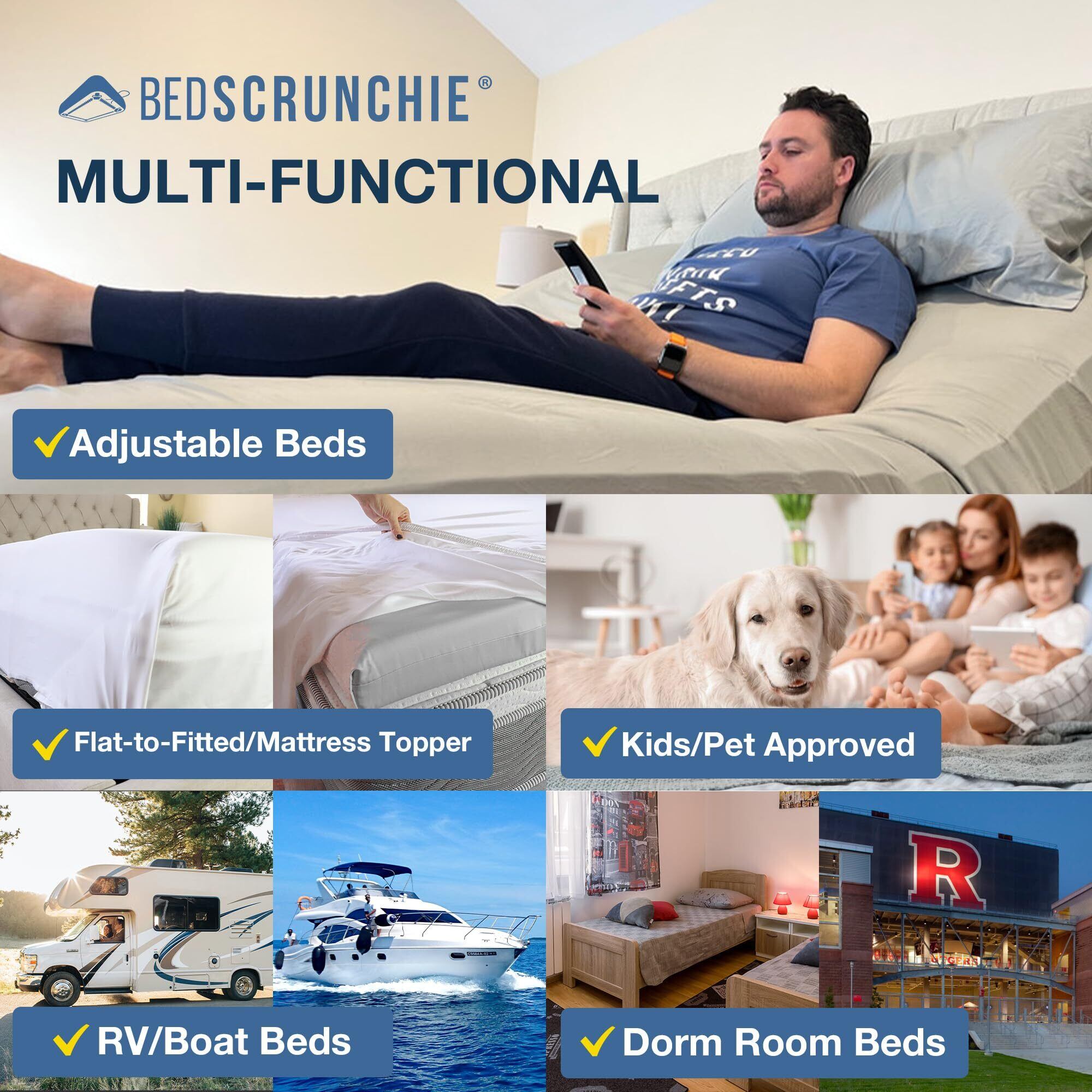 BED SCRUNCHIE (ベッドスクランチー) シートホルダーストラップ – 高耐久グリッパークリップ – 強化パラシュートコード – 360度ベッドシーツ締め具