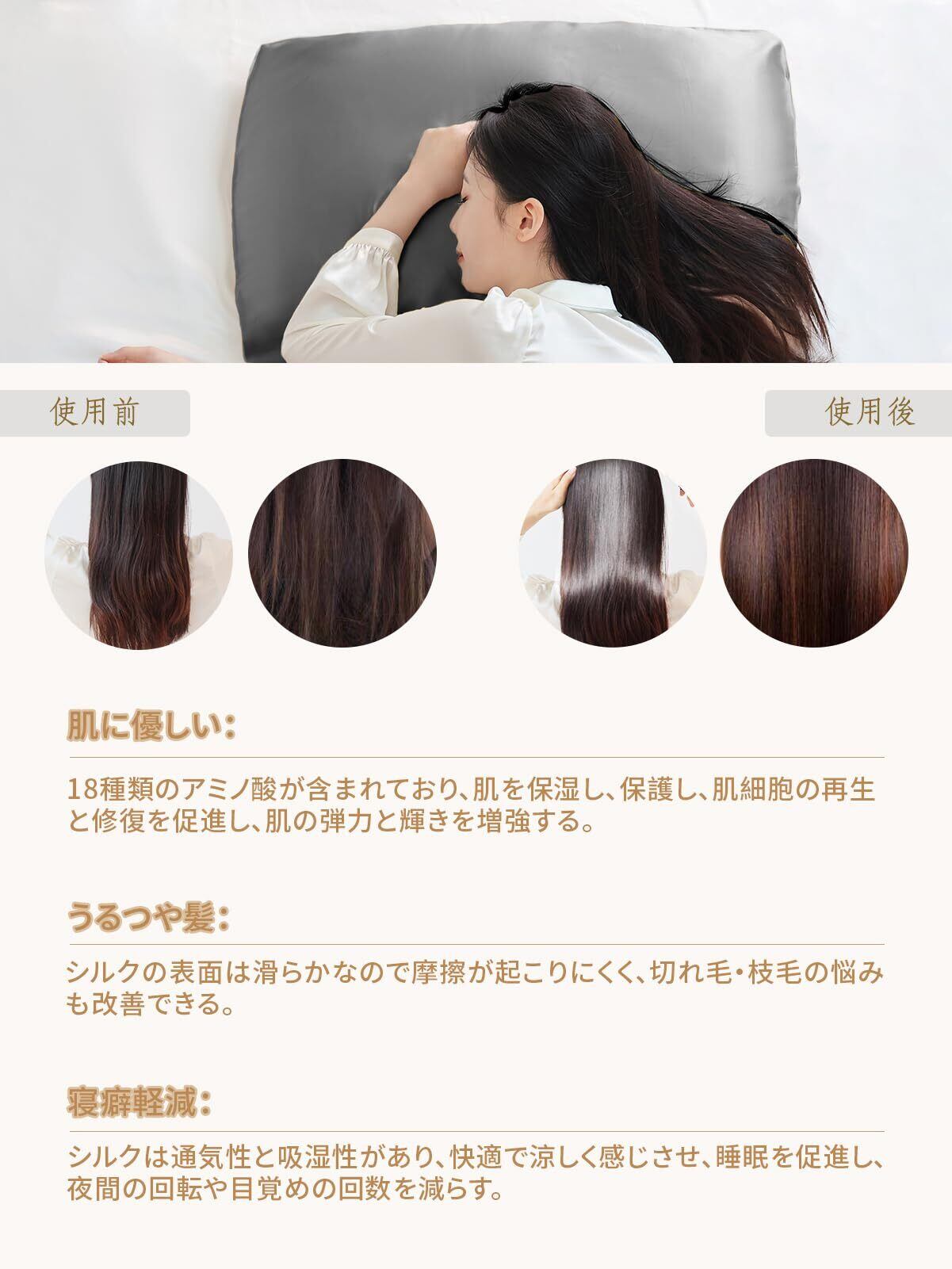 美髪・美肌: シルクは、摩擦を軽減し、肌に潤いを与える優れた素材として、近年美容界で注目を集めています。 シルクの表面は滑らかなので摩擦が起こりにくく、切れ毛・枝毛の悩みも改善できます。 シルクの枕カバーは純綿の枕カバーより通気性に優れています。肌の水分を調節し、肌に栄養を与えます。シルクも、ダニやカビの繁殖を防ぎ、皮膚アレルギーを防ぐことができます。綿と比較して、シルクの枕カバーが最適な選択です!
