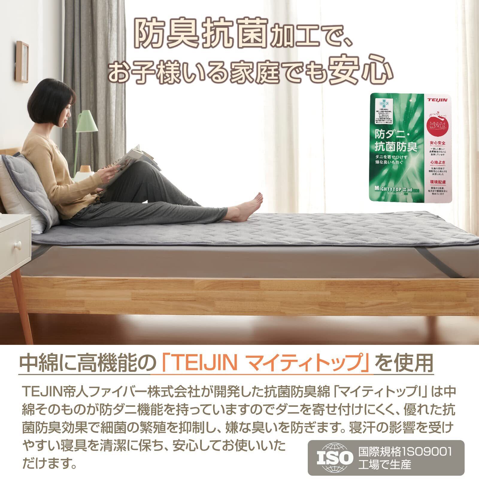 この敷きパッドは、TEIJINのマイティトップ中綿を使用しており、優れた蓄熱性を誇ります。寒さからあなたをしっかりと守り、快適な寝床を提供します。軽量でも高い保温性を実現しているため、快適な睡眠をサポートします。