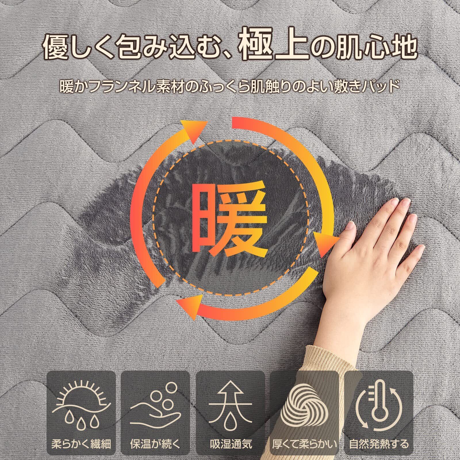 【素材・なめらかで極上の肌触り】[素材] 表面:高密度プレミアムフランネル生地、裏面:ワッフル生地、中綿:蓄熱綿(ポリエステル100%)敷きパッドは暖かさだけでなく、肌触りも追求。なめらかで気持ちの良いフランネル生地にすることで、睡眠の心地よさを向上させます。ふわっとした触感と暖かさが相まって、身体だけでなく心までぽかぽかにいたします。