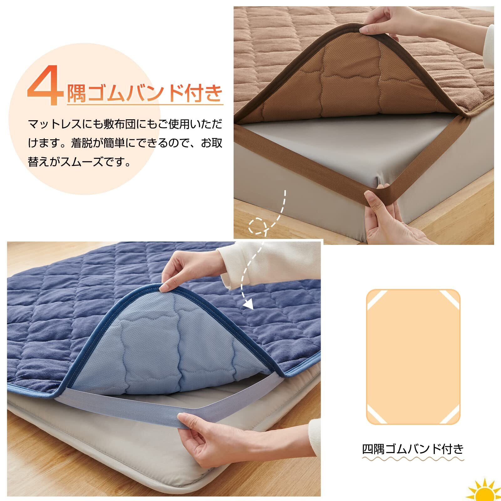 この敷きパッドは丸洗い可能で、いつでも清潔を保てます。四隅には強化ゴムバンドが付いており、マットレスにしっかりと固定でき、寝返りしてもずれません。