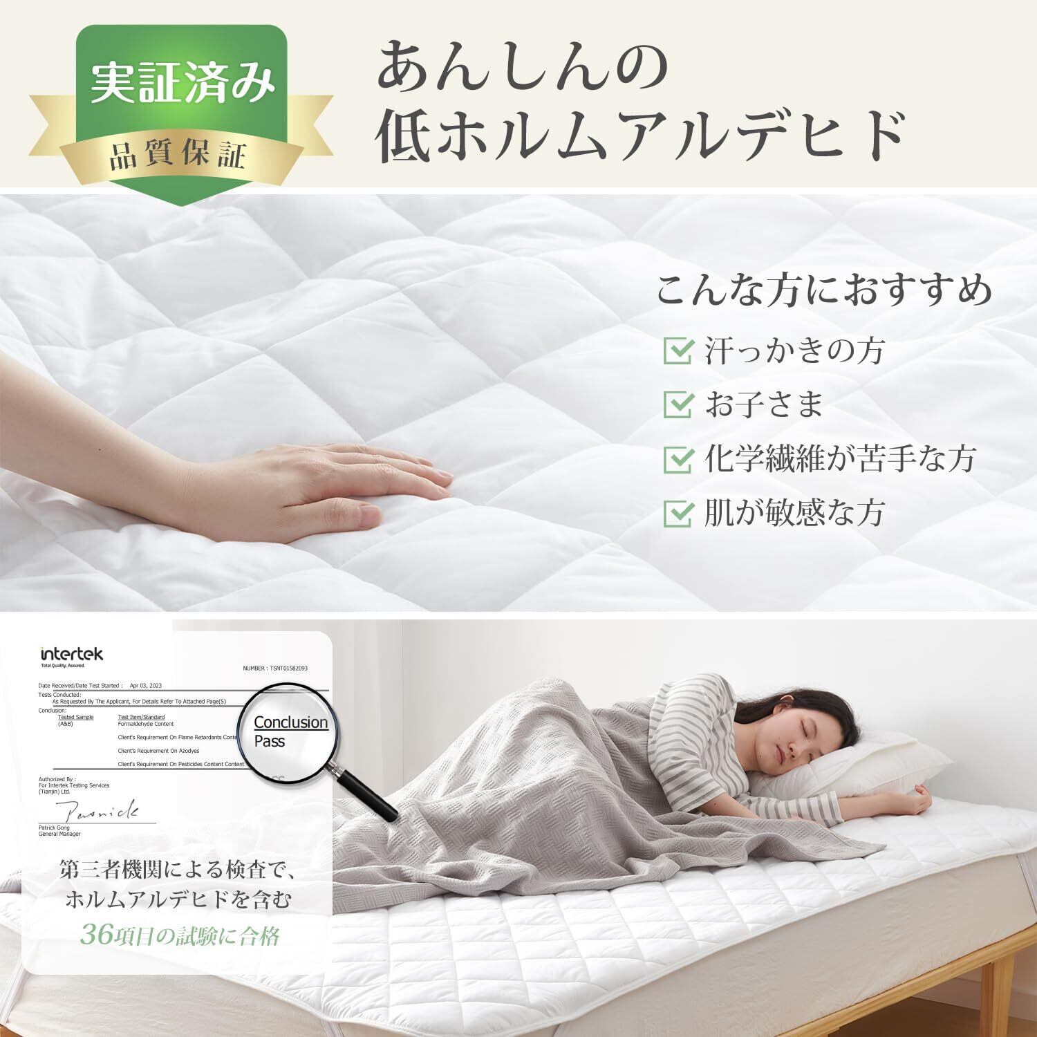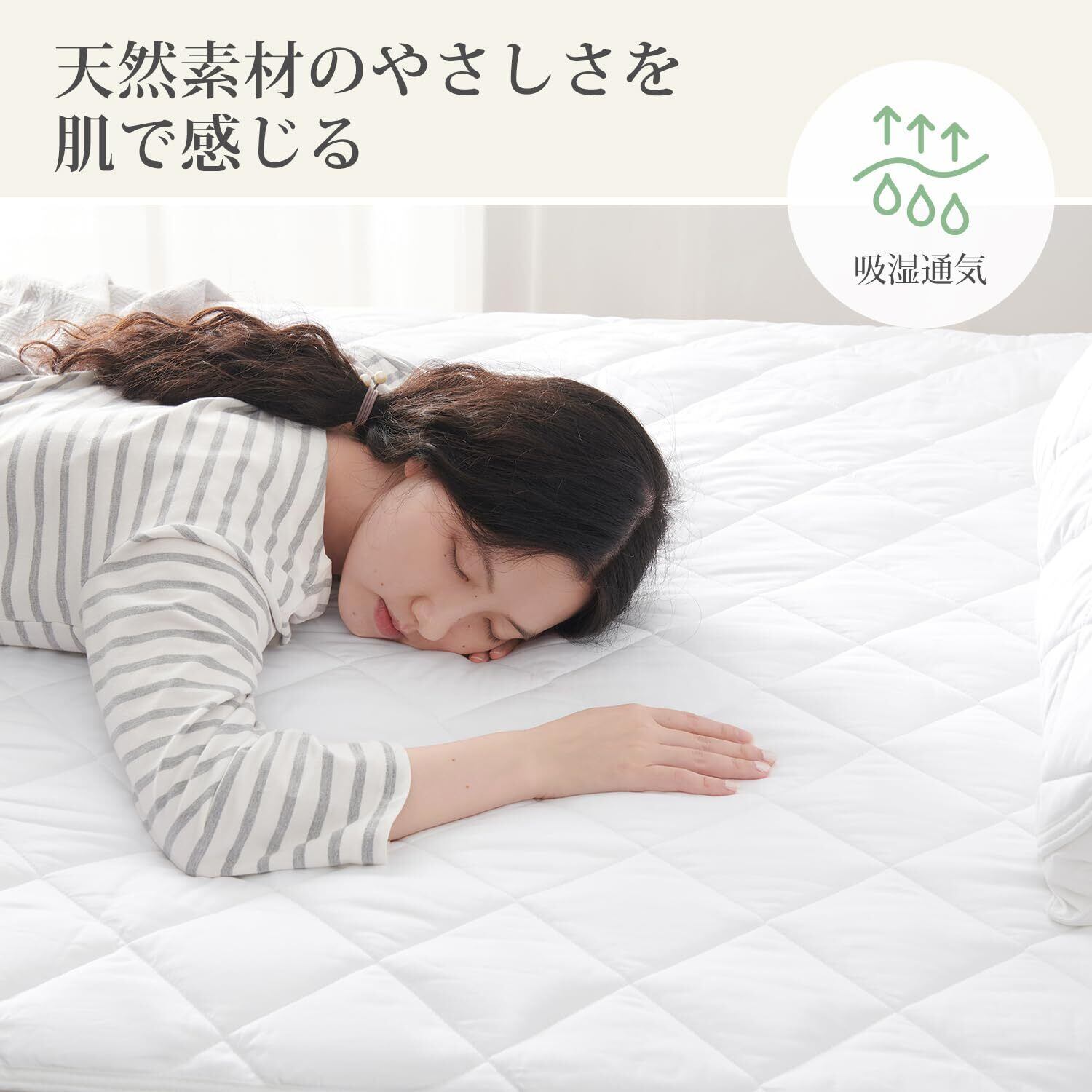 この敷きパッドにはTEIJINの高機能中綿が使用されており、優れた吸湿速乾性を持ちます。寝汗をかいてもサラッと快適にお使いいただけるので、いつでも清潔さをキープ。ダニが発生しにくい防ダニ機能も備えています。