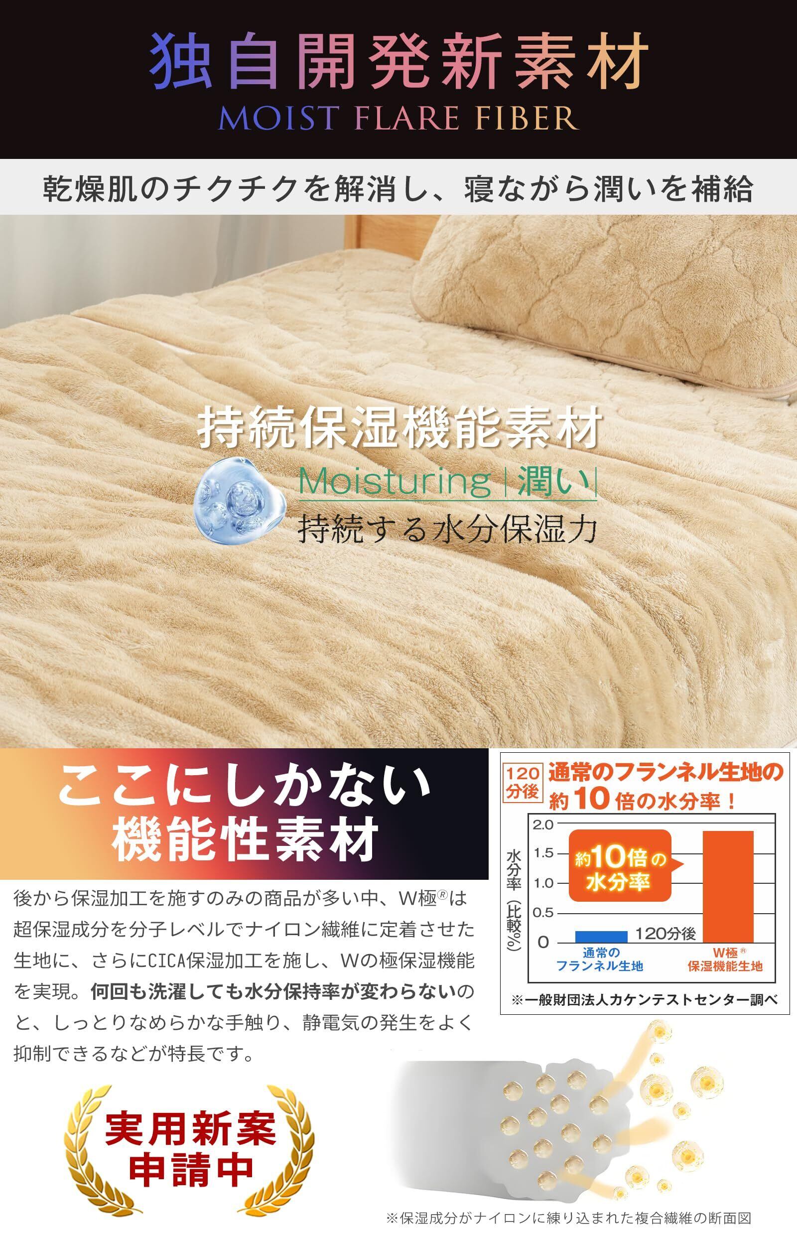 【暖かいだけじゃない!潤暖敷きパッド冬用】冬の「暖かさ」だけでなく「肌の潤い」も求めるなら、このW極モイストフレア潤暖寝具で、乾燥や冷えによる肌の悩みを一掃し、6つの先端テクノロジーが届ける「潤いあふれる暖かさ」を体感してください。独自に開発した業界初となる「持続する水分保持フランネル機能生地」が、独自の技術で超保湿成分を分子レベルでナイロン繊維に定着させ、肌に薄い「潤いの膜」をかけるような奢らかな体感をお届けします。さらに CICA 保湿加工を施すことで、ダブルの保湿効果で、肌が敷きパッドに触れる瞬間から、スキンケア成分が肌をしっかり保護し、自生の潤いを逃がさないようキープ。柔らかさが肌に密着するように寄り添い、寝ている間に自然に潤いを補給してくれるため、冬の乾燥によるチクチク感が一掃されます。冬の二大敵「冷え」と「乾燥」、潤暖 冬用敷きパッド一つで完璧対策!
