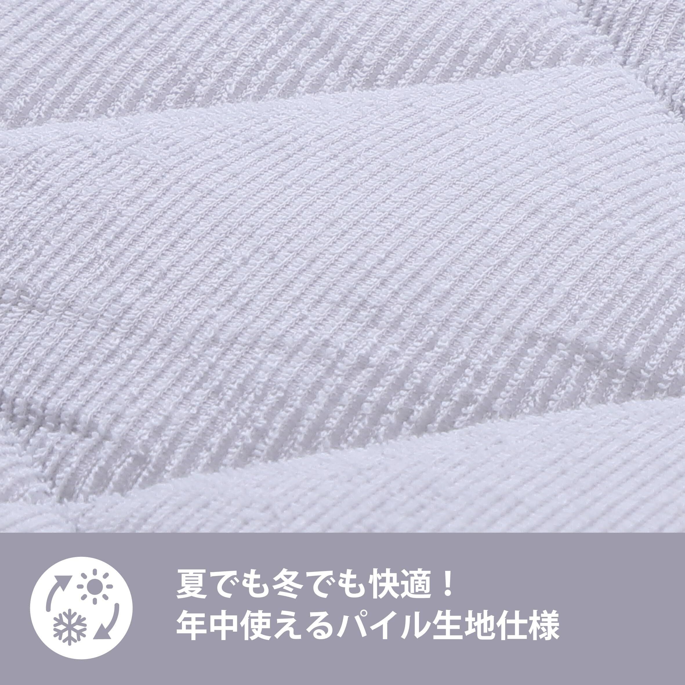 吸水性が良いので、汗ばむ夏場はべたつかずにさっぱりと使えます。夏以外の季節には、ふわふわのパイルがやさしい温もりを持ち、お布団に入る瞬間のひやっと感を防いで快適に眠れます。夏から冬まで一年中活躍する便利な1枚です。