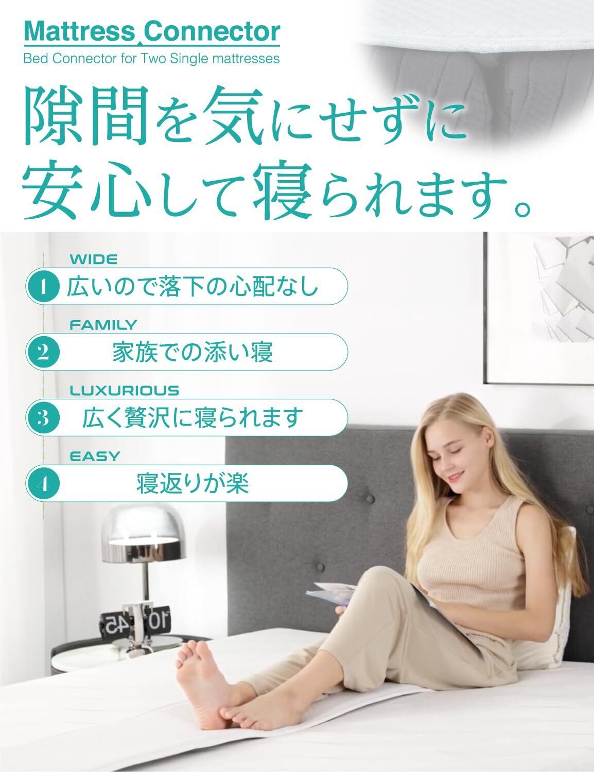 【耐久性抜群、使い心地にこだわりの素材】●通常のすきまパッドと違い、本体の表面に通気性の良い生地が縫製されていますので、柔らかい肌触りとマットレス/ベッドとの程よいフィット感によって、寝るときの違和感をさらに軽減し、真ん中に寝るお子様も快適に寝ることができます。●すきまパッドの中材は高反発ウレタンを採用、クッション性と復元性抜群です。竹炭入りの仕様なので、変色やニオイの心配もなく長く使い続けられます。●【お子様にも安心!日本国内品質検査済み】本品は日本第三者機関検査で低ホルムアルデヒド仕様で検証済。毎日肌に触れるものですので、子供にもご安心にご利用いただける品質を提供しております。