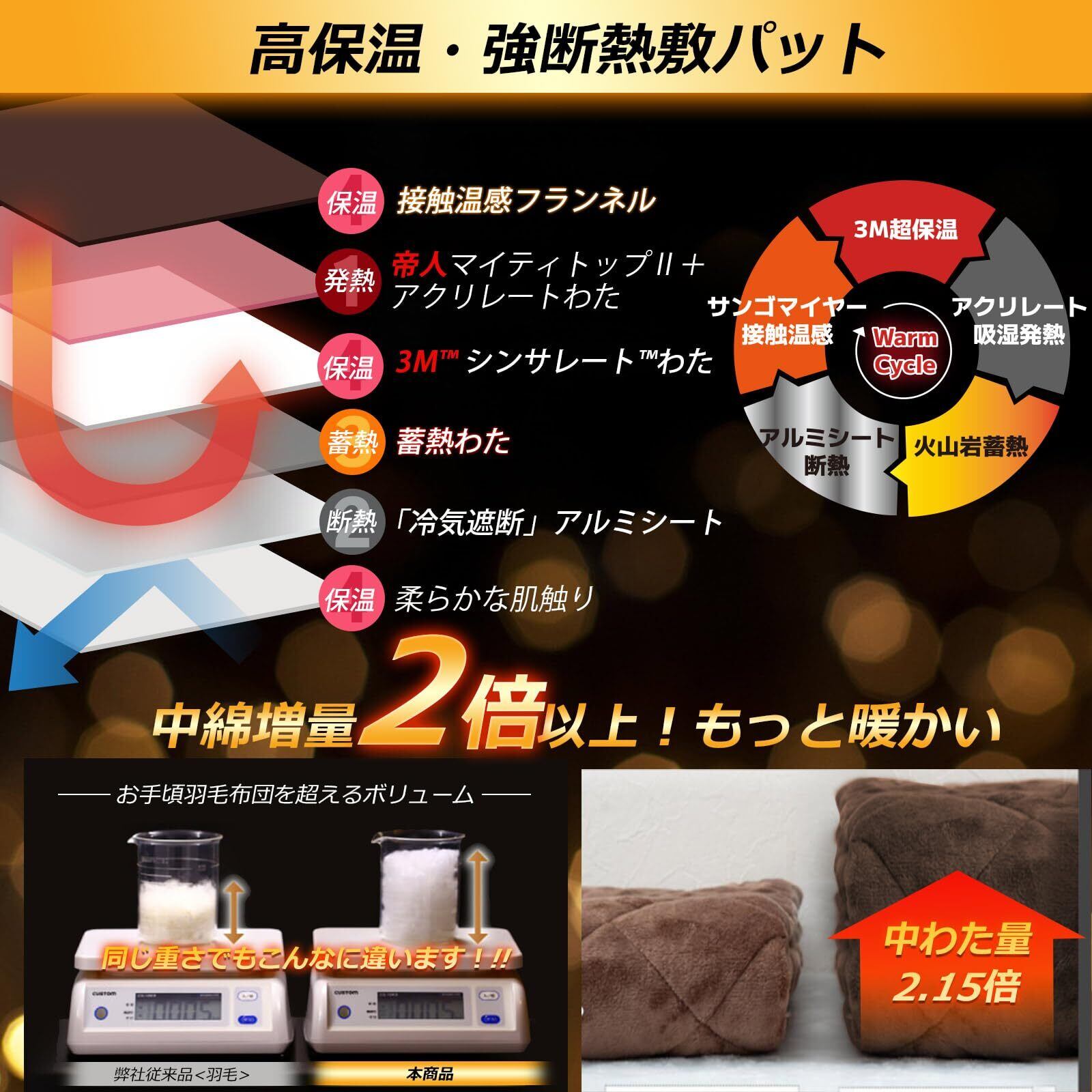 「宇宙級多重保温!暖かさ50%爆上げ革命」接触温感フランネル+最先端エアロゲル+吸湿発熱アクリレート+蓄熱綿+3Mシンサレートが織り成す最強レイヤー!冬敷パットは従来比保温力50%アップの極暖空間を実現。寒い夜もベッドパッドの中は別次元の温もりが持続!「寒いベッドパッドに飛び込む勇気」が不要になる、人類史上最高の入眠体験を提供!