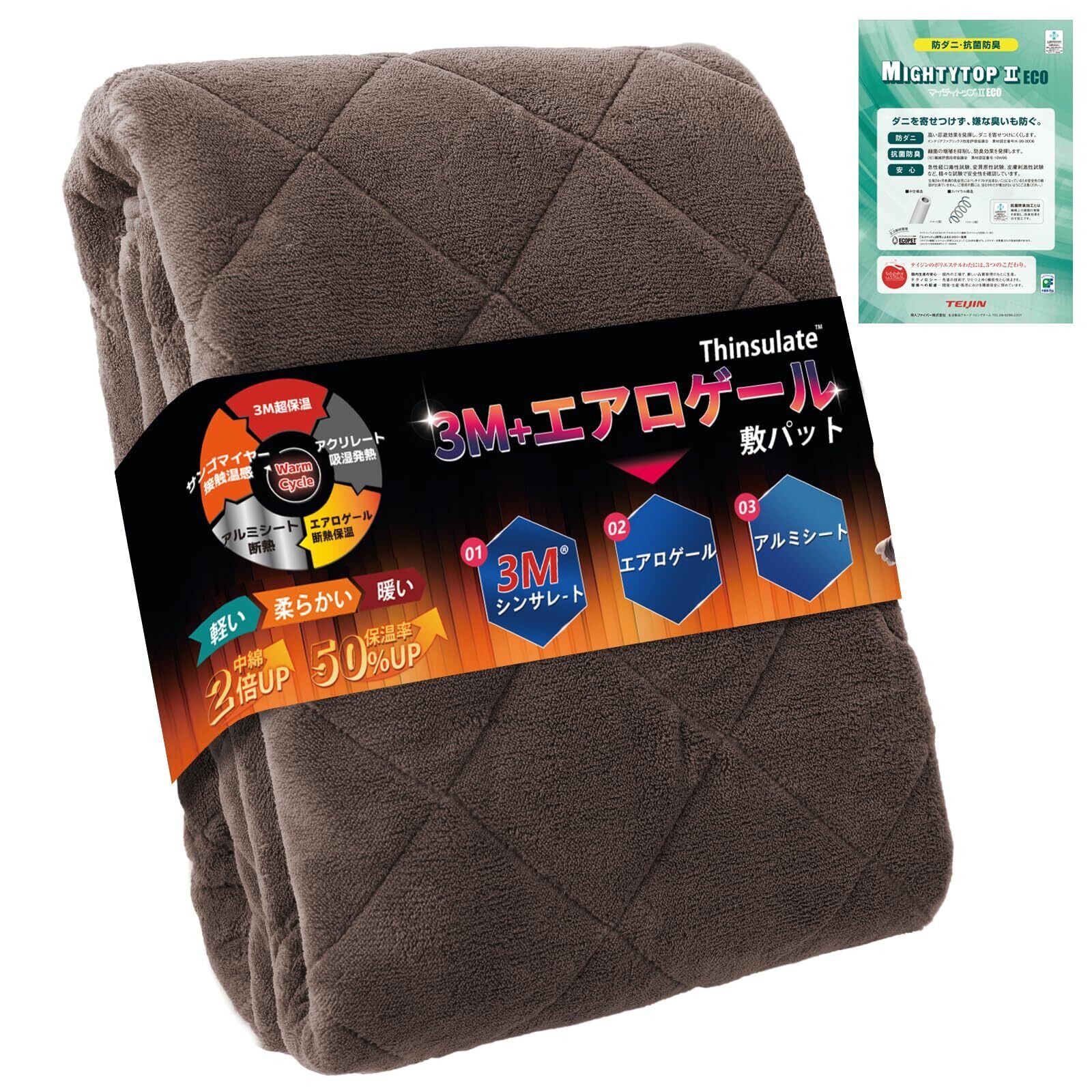 「極寒対応・帝人TEIJIN中綿入り」敷パット エアロゲルx3Mシンサレート™超断熱 多重保温 接触温感 敷き毛布 パット ベッドパッド 厚手 4大消臭 吸湿発熱 柔らか 丸洗い 軽量 あったか 蓄熱保温 断熱 アルミシート入り フランネル 静電気防止 防ダニ加工 蒸れにくい 日本企画 シングル 100*200cm ブラウン Bestoneplus