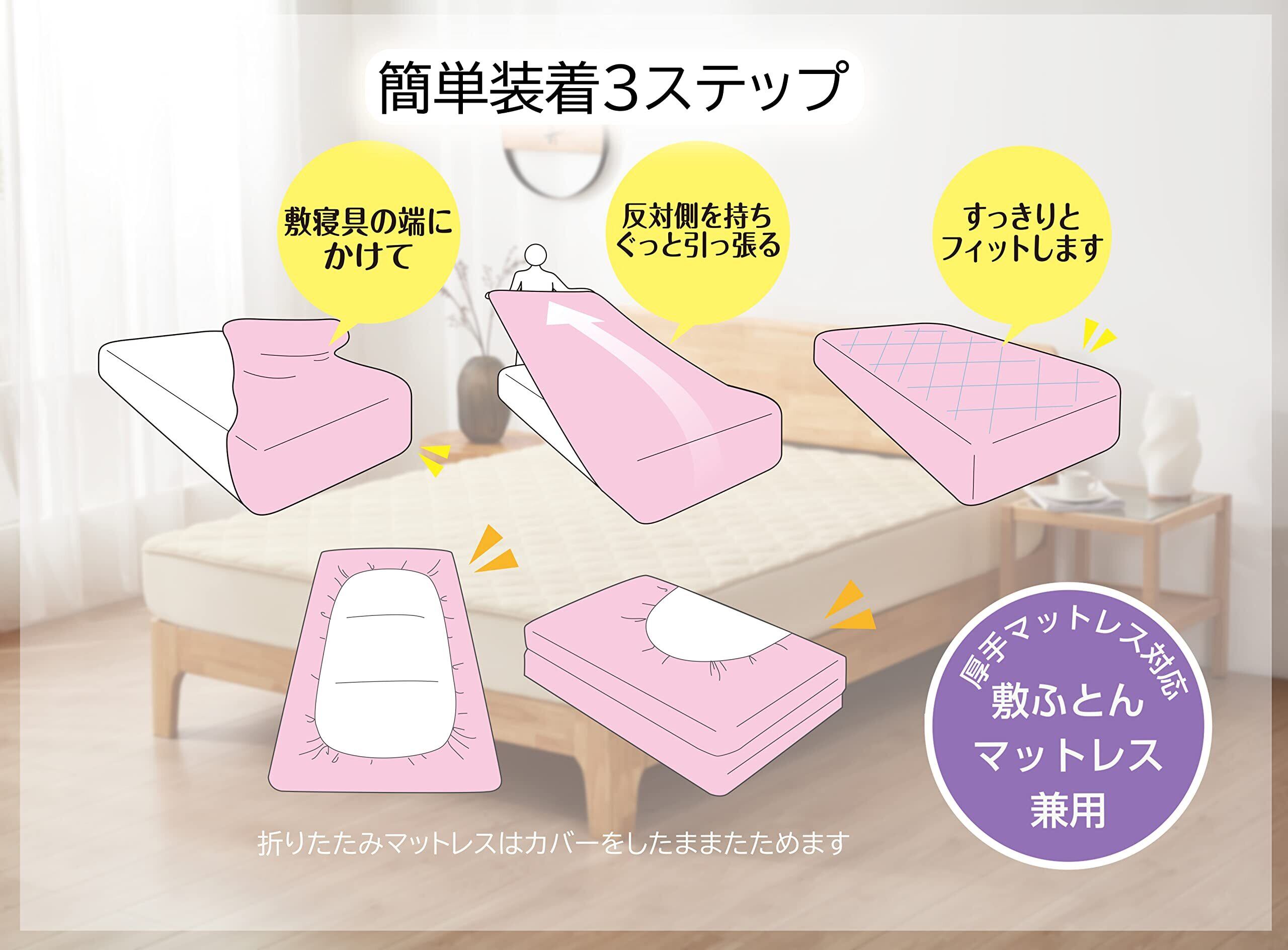 【ボックスシーツ+敷きパッド 一体型】:ほどよい厚みの中綿を入れ、ふんわり心地よい寝心地を実現しました。一体型なので敷パッドの取り付け用ゴムが表に出ることもなく見た目もキレイ!全周フィットゴム付きで取り付けも簡単です。ベッド用、マットレス用、敷ふとんなどにも使えます。