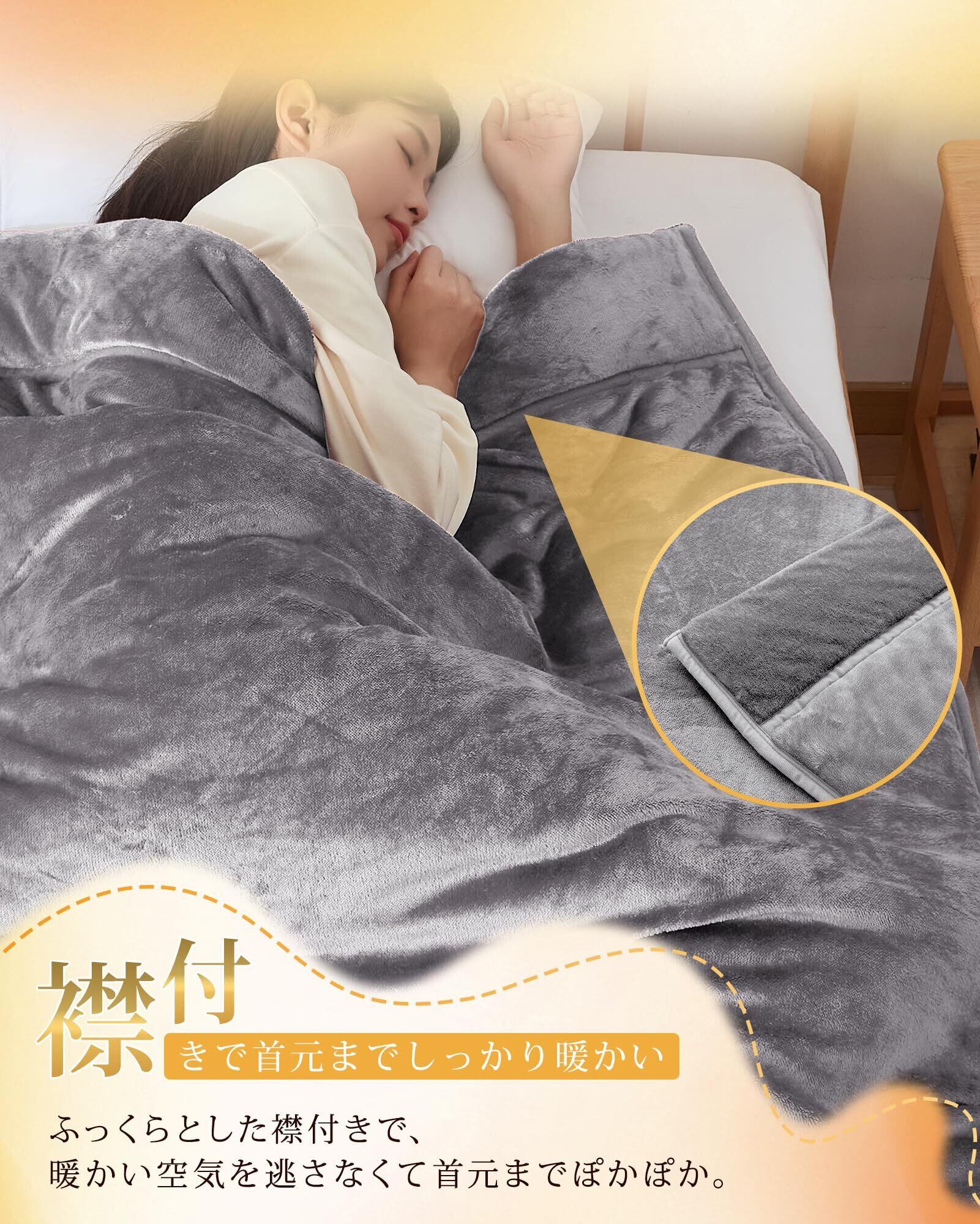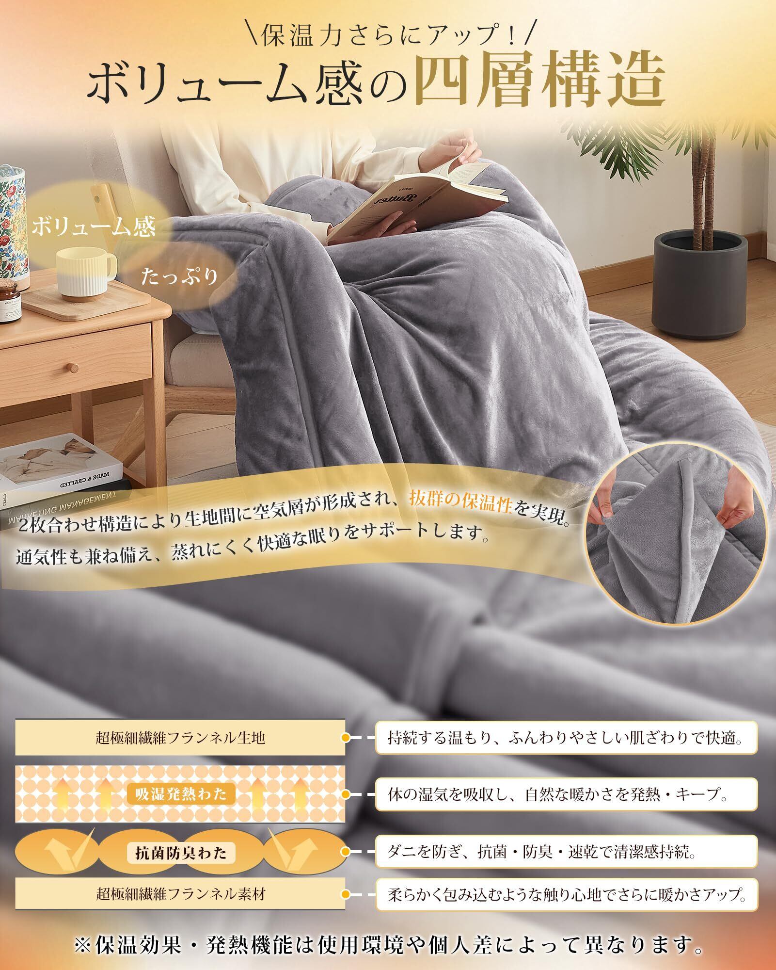 【二枚合わせ・保温力アップ】ふわふわとしたフランネル生地を二枚合わせにして、吸湿発熱中綿を詰めた四層構造のブランケットです。繊維の高い密度で保温性に優れ、暖かさをしっかりキープしてくれます。さらに、二枚合わせのフランネルで中の空気層は暖かい空気を毛布に閉じ込めて、一般の毛布より保温力が高まります。また、襟付きがありますので首元まで暖かいです。寒い季節にも心地良い眠りをサポートしてます。