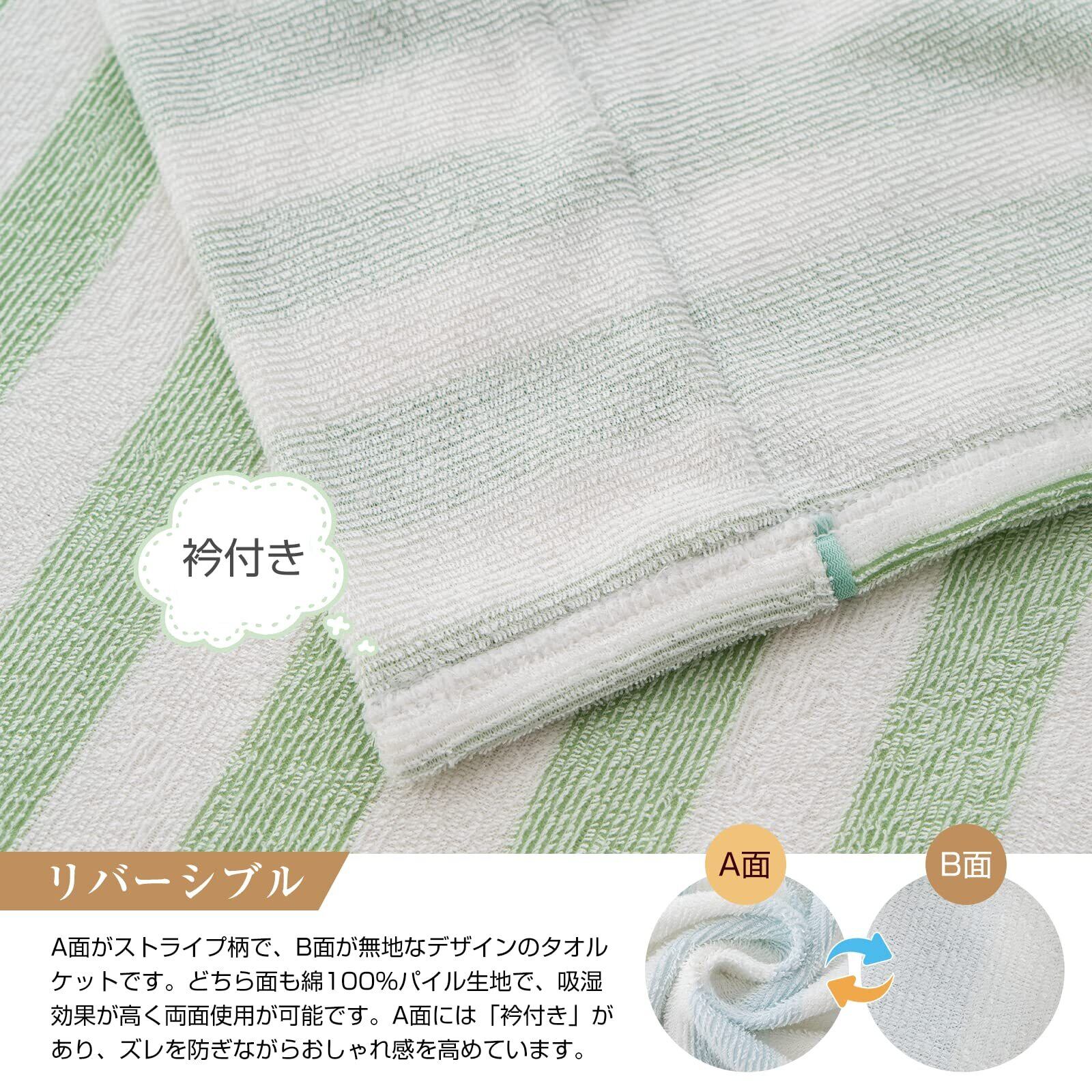 【吸湿通気性・リバシーブル】 両面が使えるやさしい肌触りのタオルケットです。パイルは綿100%で、吸水性が良いので寝ている間の汗や湿気を吸ってさらさらに保ちます。なめらかでしっかりしたボリュームと通気性があります。両面は異なるスタイルです。A面が縞柄(衿付きあり)で、B面が白い無地のタオル地です。シンプルなスタイルで、和室にも洋室にもぴったりです。お好みに合わせて、好きな面をお選びください。※両面を貼り合わせる必要があるため、特殊加工で仕上がりは少し硬いかもしれませんが、1回洗濯するとふんわり感が戻ってきます。